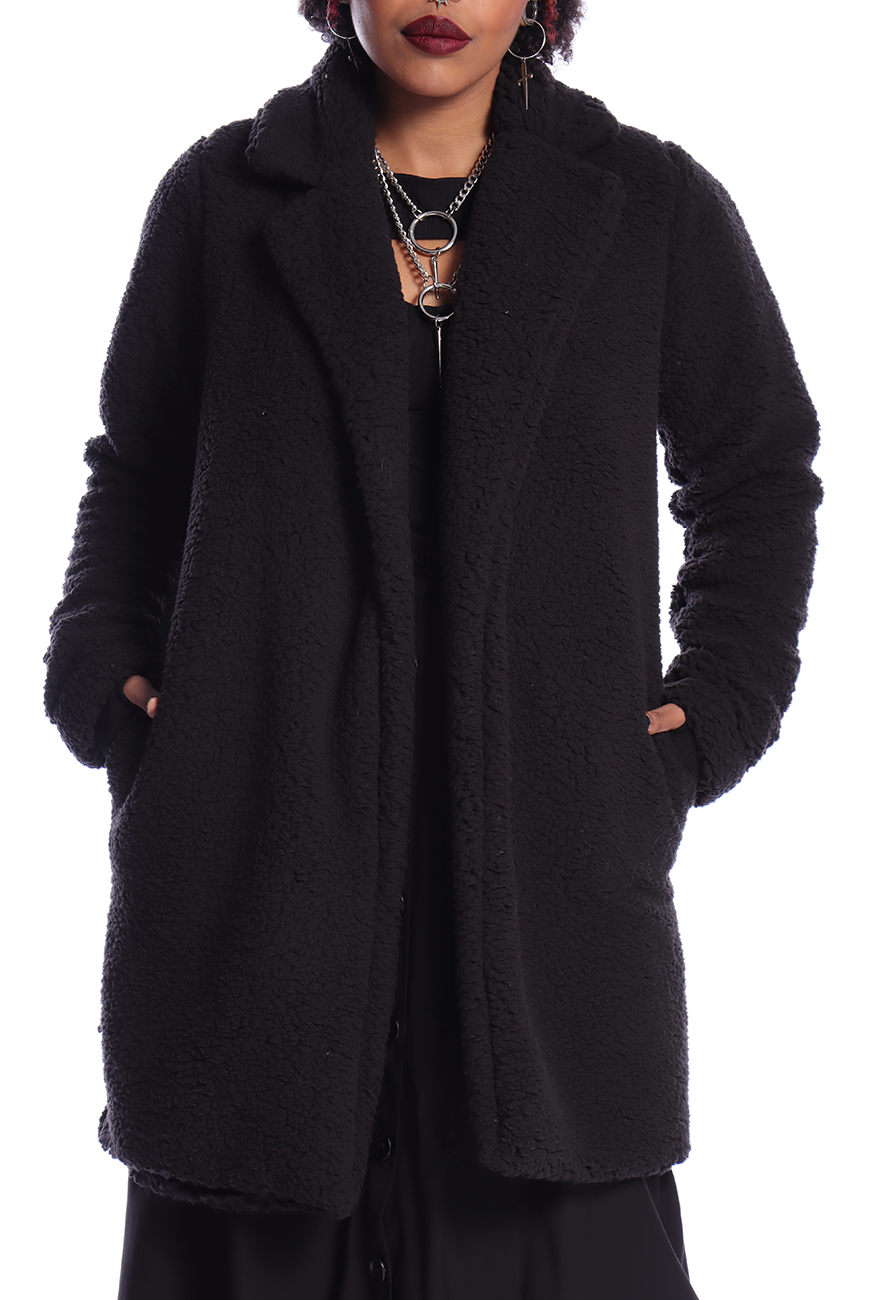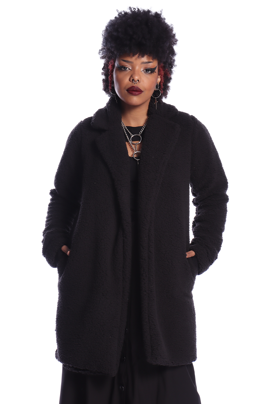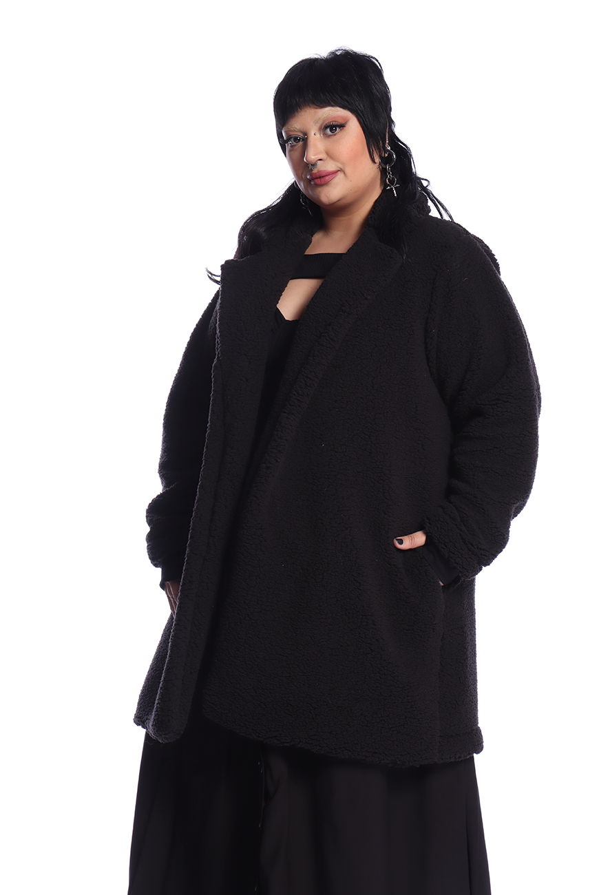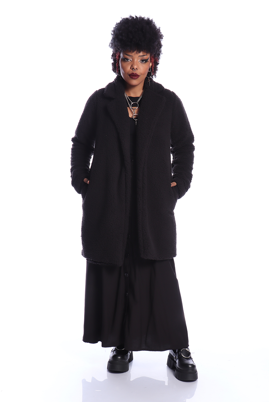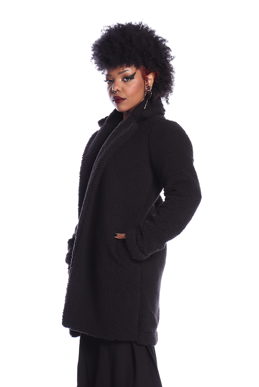 O Casaco Pelúcia Preto Widow foi desenvolvido com modelagem de blazer e produzido em pêlo sintético de alta qualidade, com um toque macio e textura beeeem fofinha. Possui bolsos nas laterais para mais praticidade.