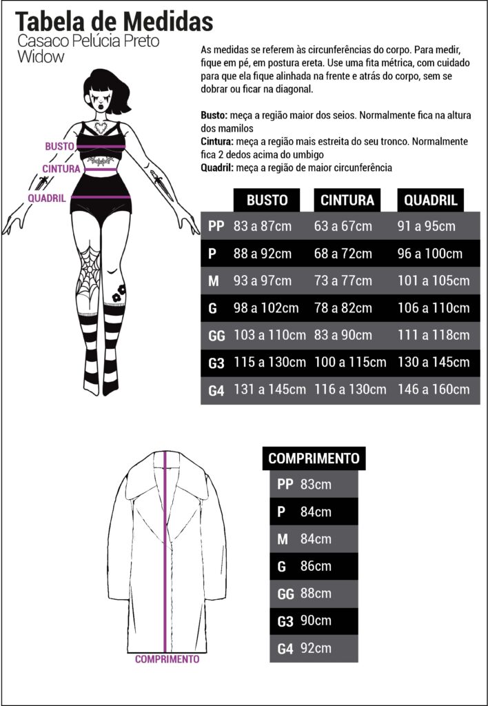 Modelo tamanho 3G: Altura: 1,60m/ Cintura: 95cm/ Busto: 113cm/ Quadril: 131cm.