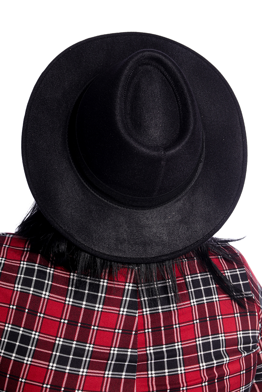 Chapéu tipo fedora preto, feito de feltro, com forro de cetim. Produzido no Brasil. Circunferência 61cm.