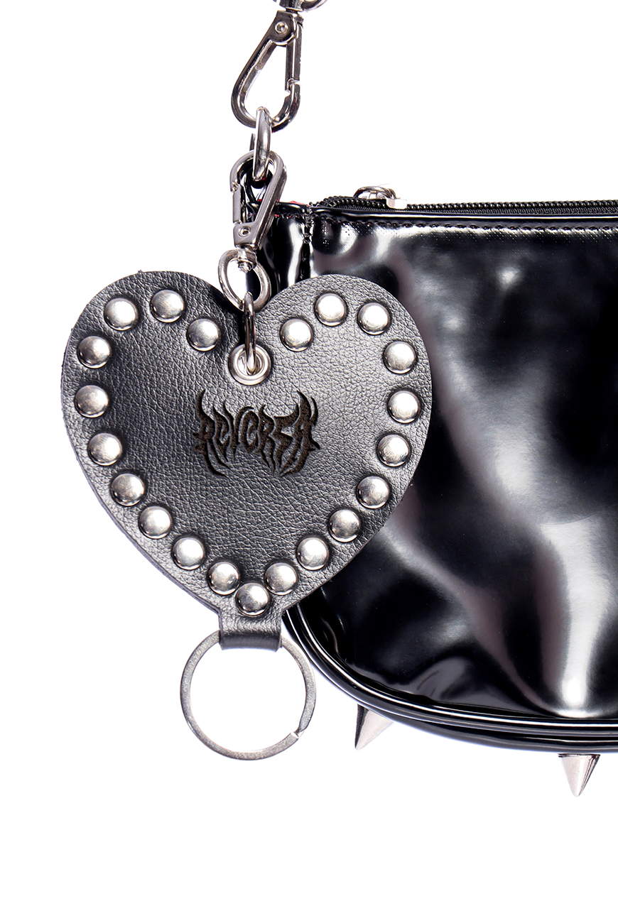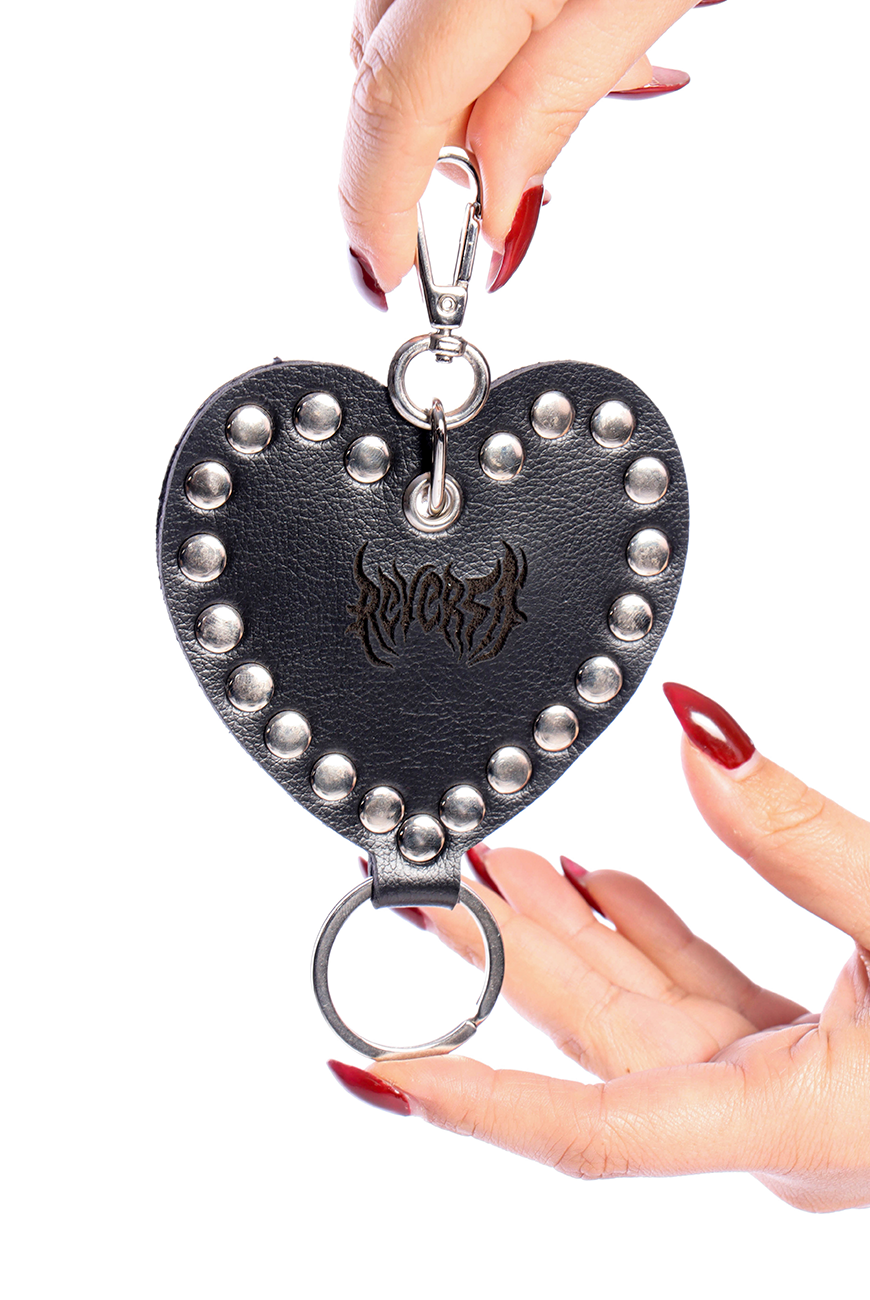 Produzido em napa preta sintética de origem não animal, ele tem o formato de coração, todo rebitado, com queima Reversa no meio, mosquetão para pendurar e uma argola extra para poder pendurar chaves ou outros chaveiros.