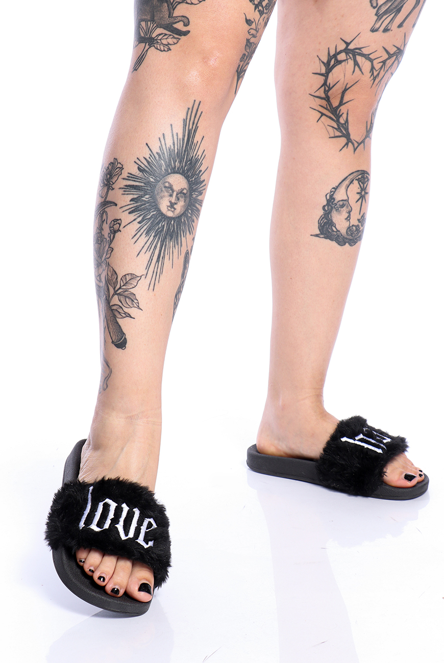 O Chinelo Pelúcia Preto Love Hate é uma novidade super exclusiva da Reversa para as madames trevosas que adoram um chinelinho confortável!