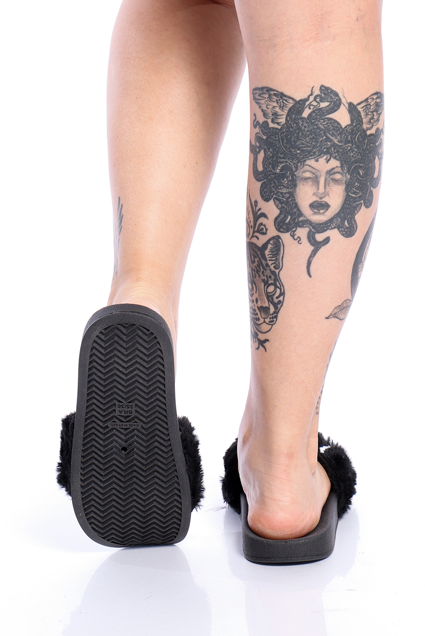 Produzido no modelo slide com um solado macio e confortável, a tira é revestida por uma pelúcia preta super macia e fofa.