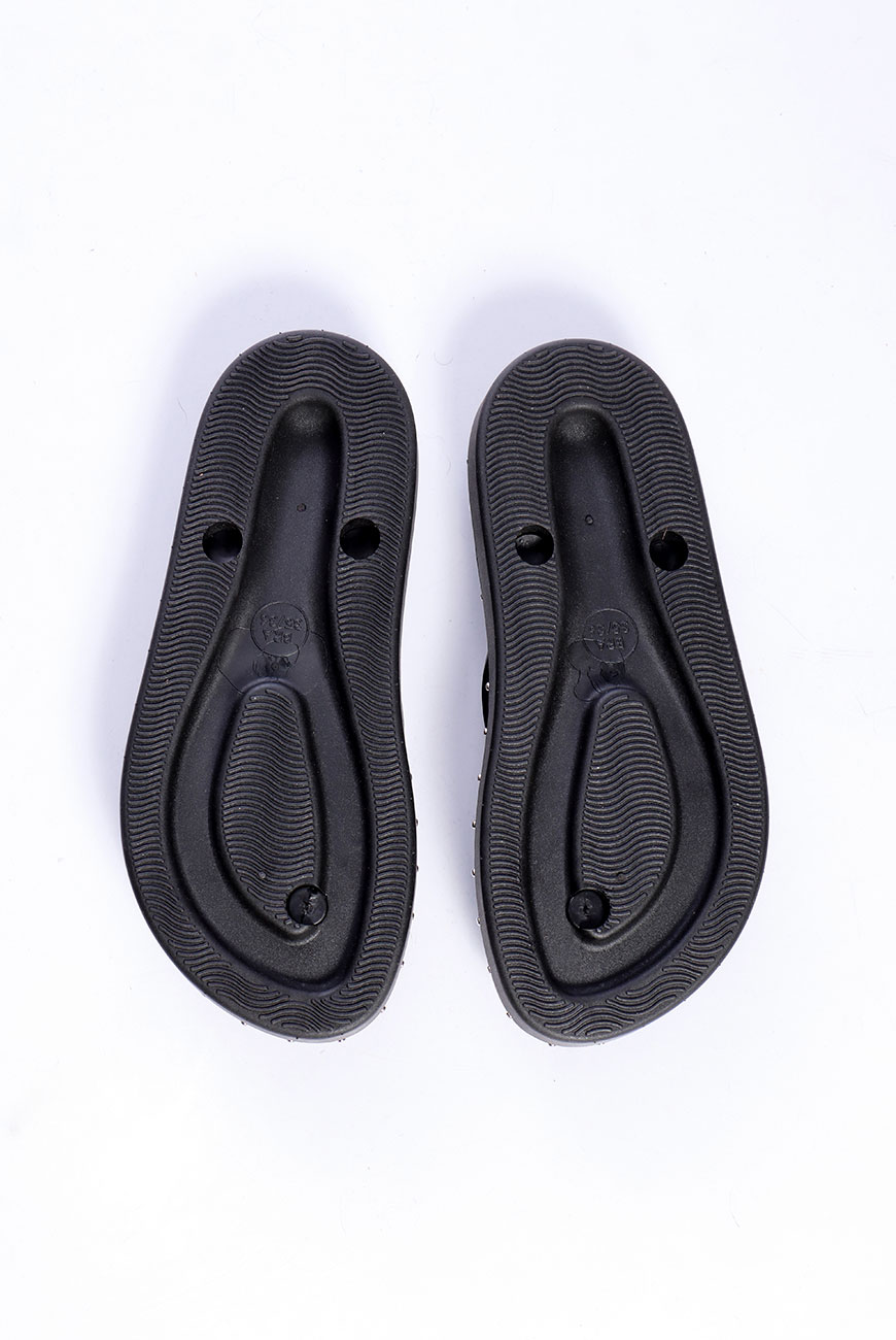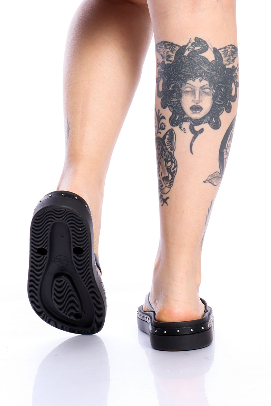 Possui solado mais robusto e com frisos antiderrapantes para proporcionar maior segurança e conforto ao caminhar. Nas tiras possui spikes niquelados e tachinhas redondas em todo o contorno do solado, trazendo muito estilo e peso para o modelo.