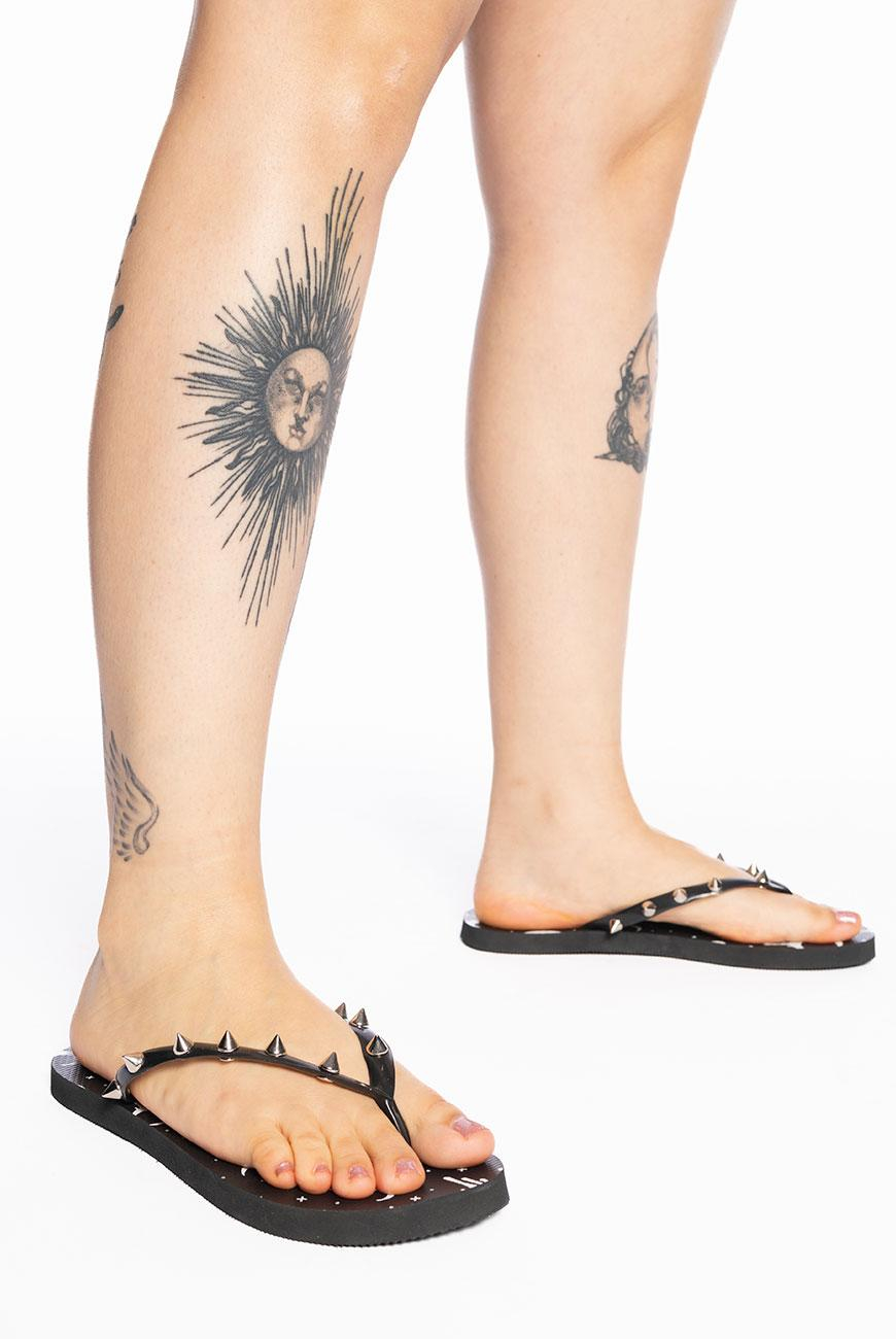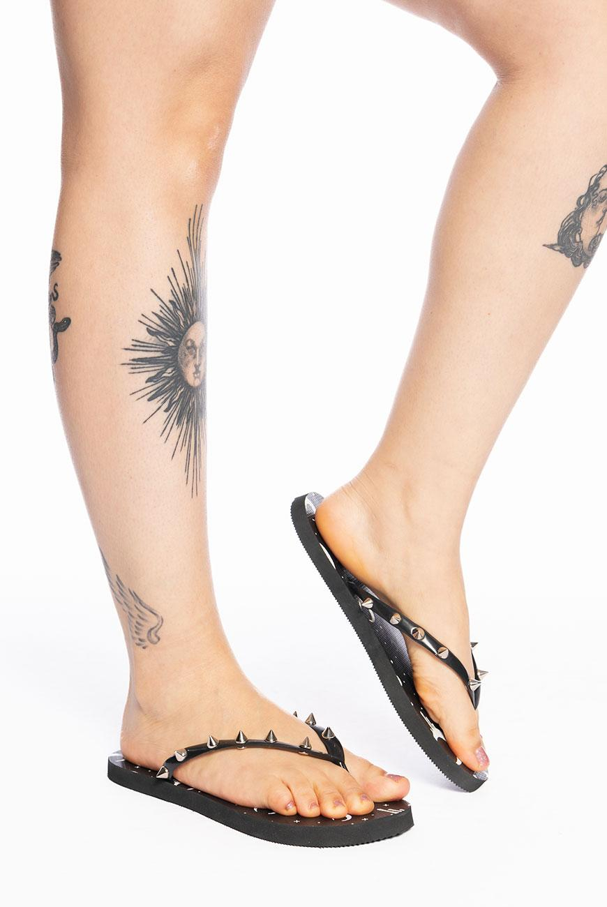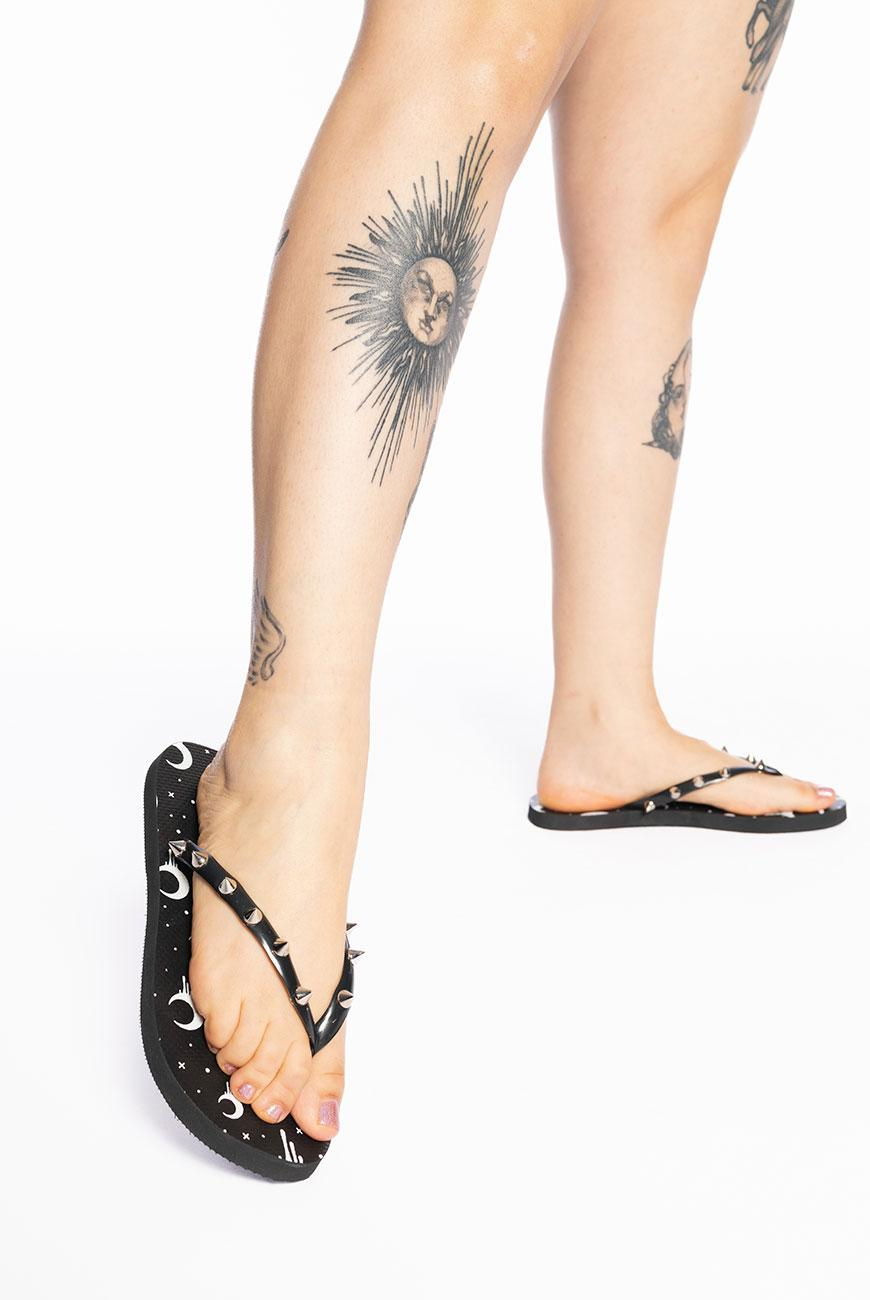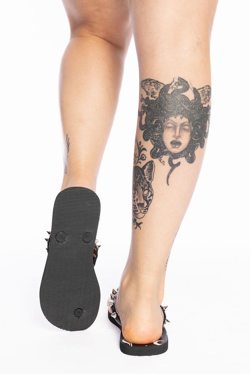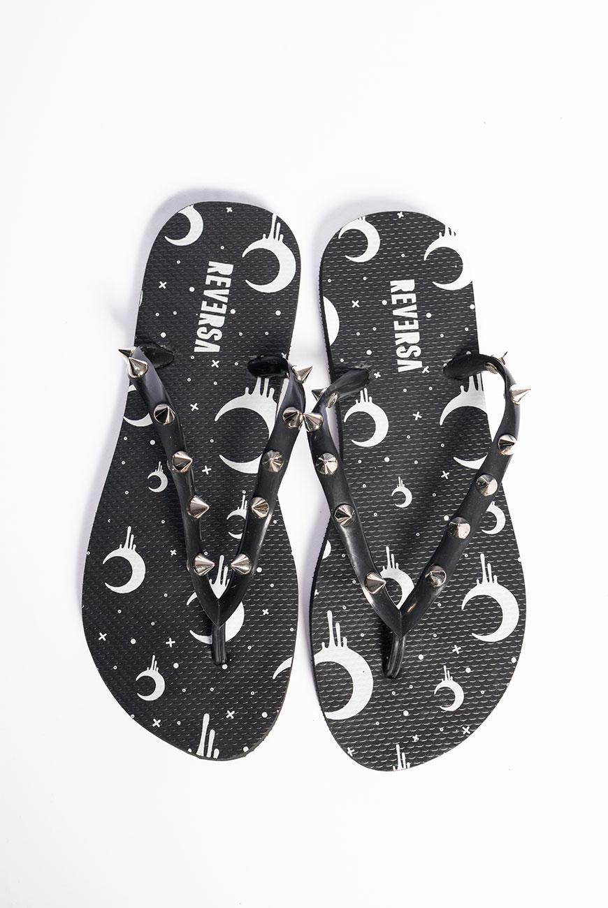 Chinelo com estampa exclusiva da lua da Reversa na palmilha e spikes niquelados nas tiras. nModelo básico, possui solado flexível, emborrachado e com frisos antiderrapantes para proporcionar maior segurança e conforto ao caminhar.nnO Chinelo Spikes Moon Pride é o chinelo perfeito pra acompanhar a sua praia ou piscina sem perder a trevosidade. nnProduto exclusivo Reversa, produzido no Brasil.nnConservação: Passe uma flanela macia umedecida com água e um pouco de detergente neutro suavemente pela superfície da peça para remover a sujeira. Evite molhar o produto (principalmente com a água do mar), porque oxida os metais. Evite o contato com materiais que possam danificar a estampa, como areia, escovas de limpeza e materiais abrasivos. Não exponha diretamente ao sol. Seguindo essas orientações, seu chinelo terá uma durabilidade muito maior.nn
