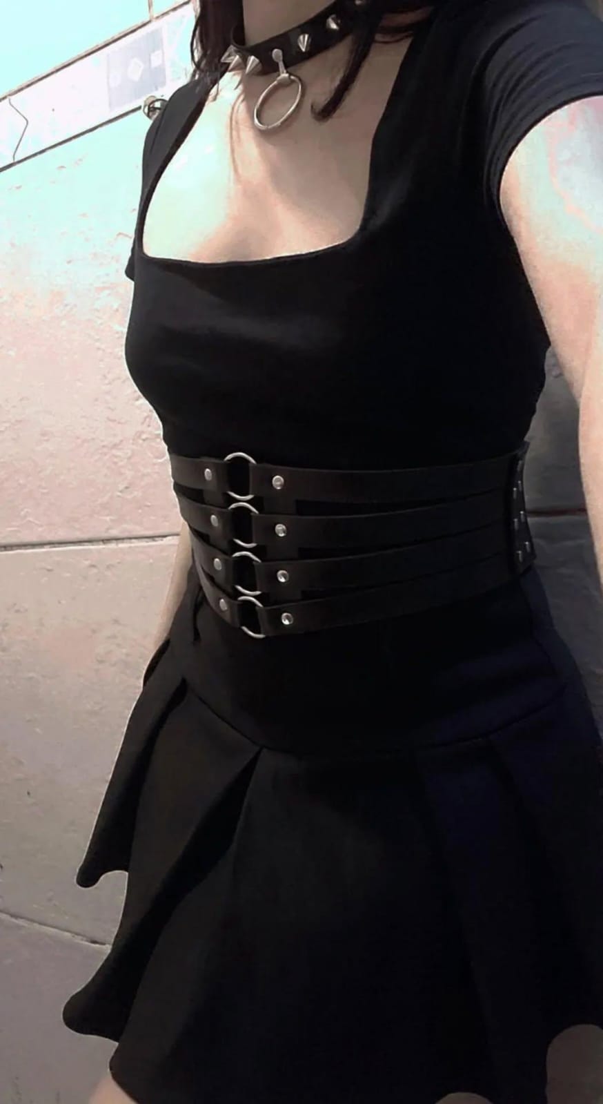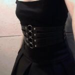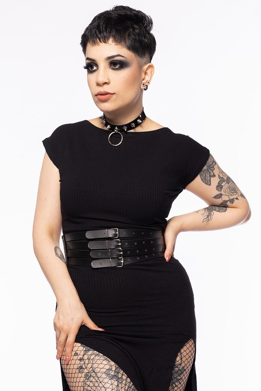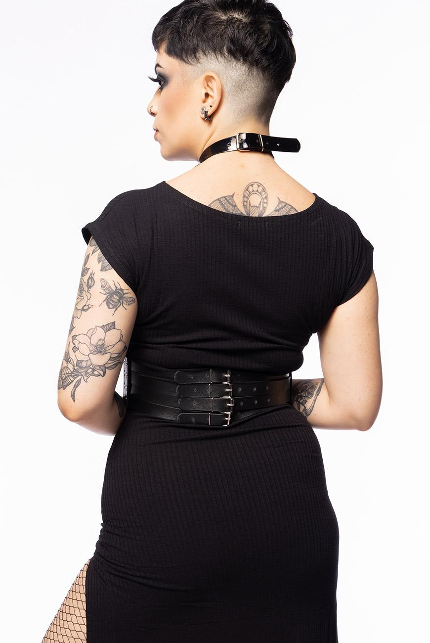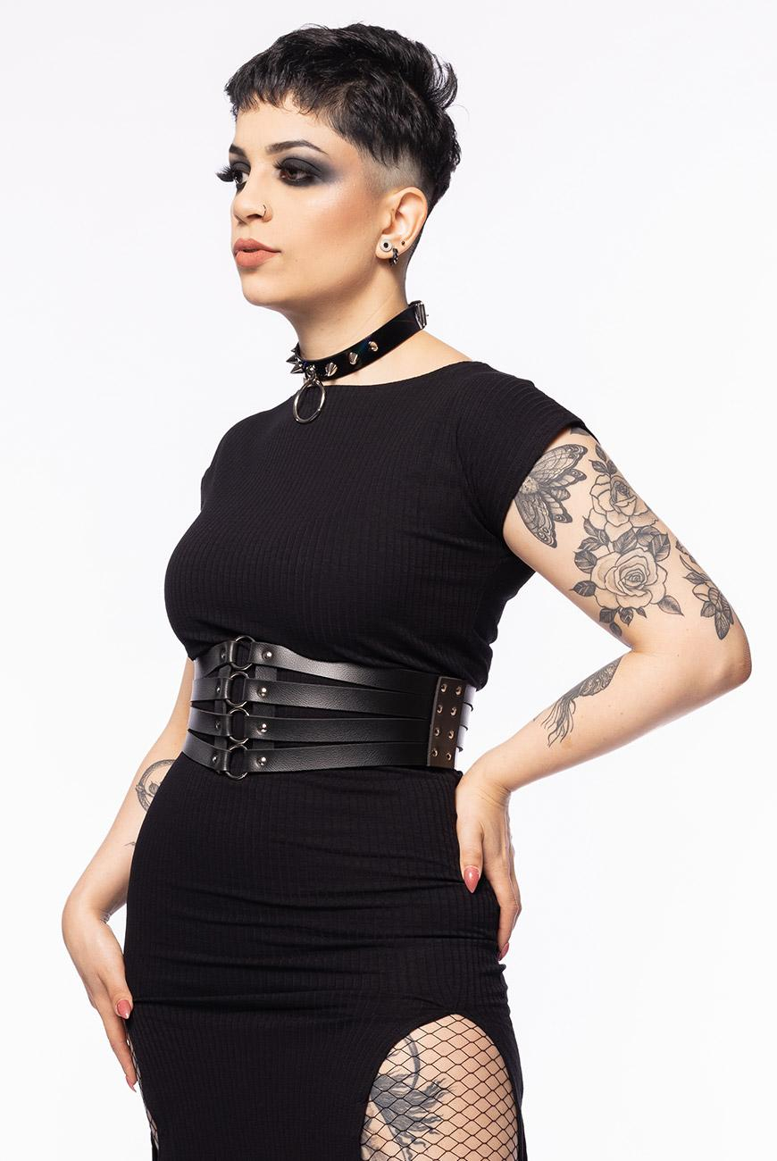 Cinto em material de origem não animal, possui formato corset, argolas na parte frontal e tiras com fivelas para regulagem na parte traseira. Uma nova versão do cinto Wicked em metais niquelados e ainda mais prático e versátil. É perfeito para marcar bem a cintura, podendo usar sobreposto a qualquer peça. Dica: fica lindo para usar com a parte das fivelas virada para a frente.
