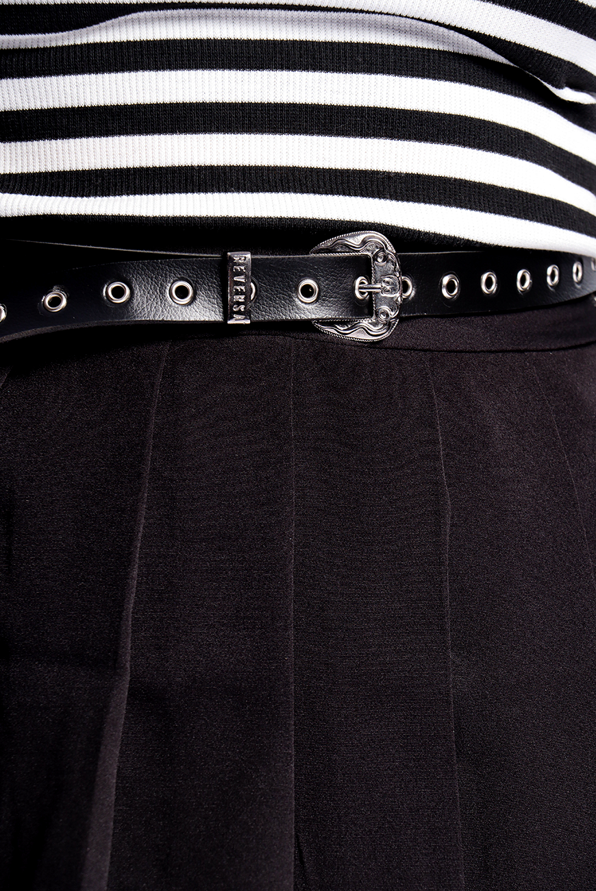 O Cinto Fino Fivela Western é produzido em material sintético de origem não animal, com conjunto de fivela western exclusiva da Reversa e bastante ilhoses por sua extensão, possibilitando o uso como cintura alta ou baixa.