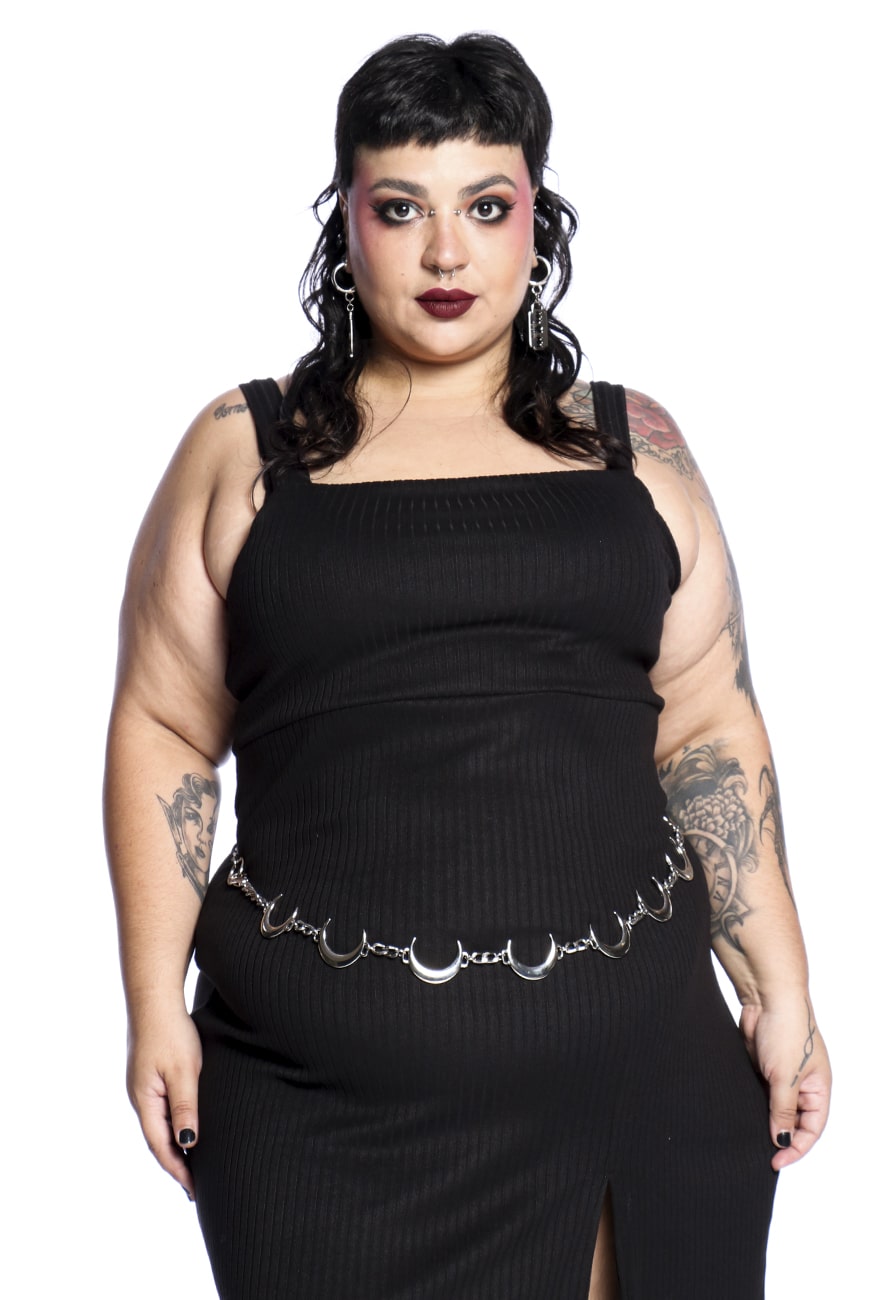 Com inspirações no whimsigoth, esse cinto foi produzido com luas no banho níquel unidas entre correntes, com mosquetão como fecho, tornando o cinto adaptável para diferentes medidas.