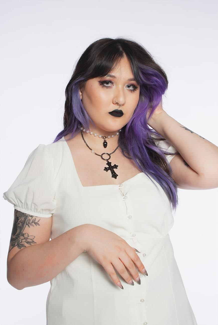 Colar duplo, sendo um de contas brancas e pingente de caveira preto e o outro de corrente de metal no banho ônix, adornado com uma pérola e uma argola, além do pingente lindíssimo de cruz preta.