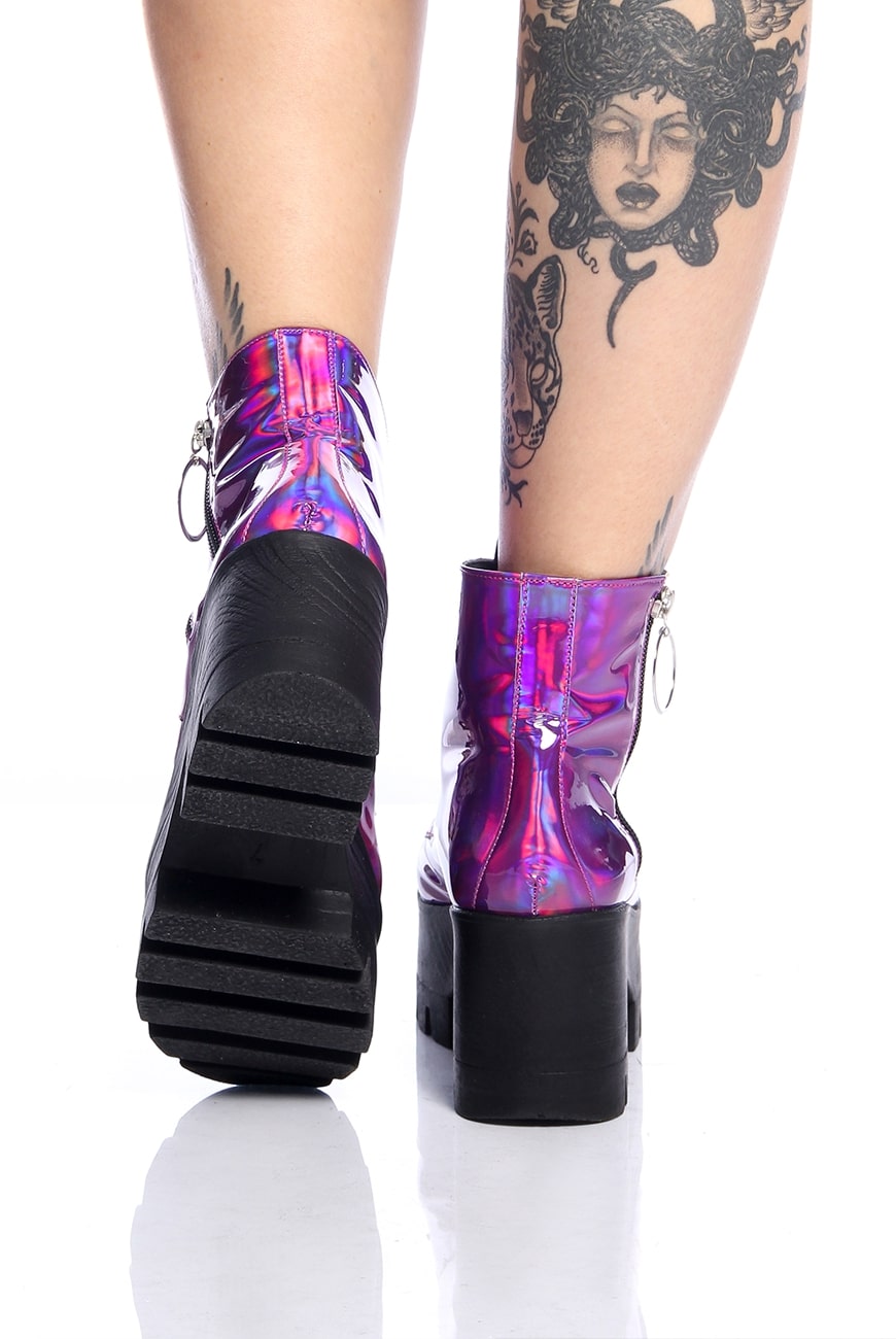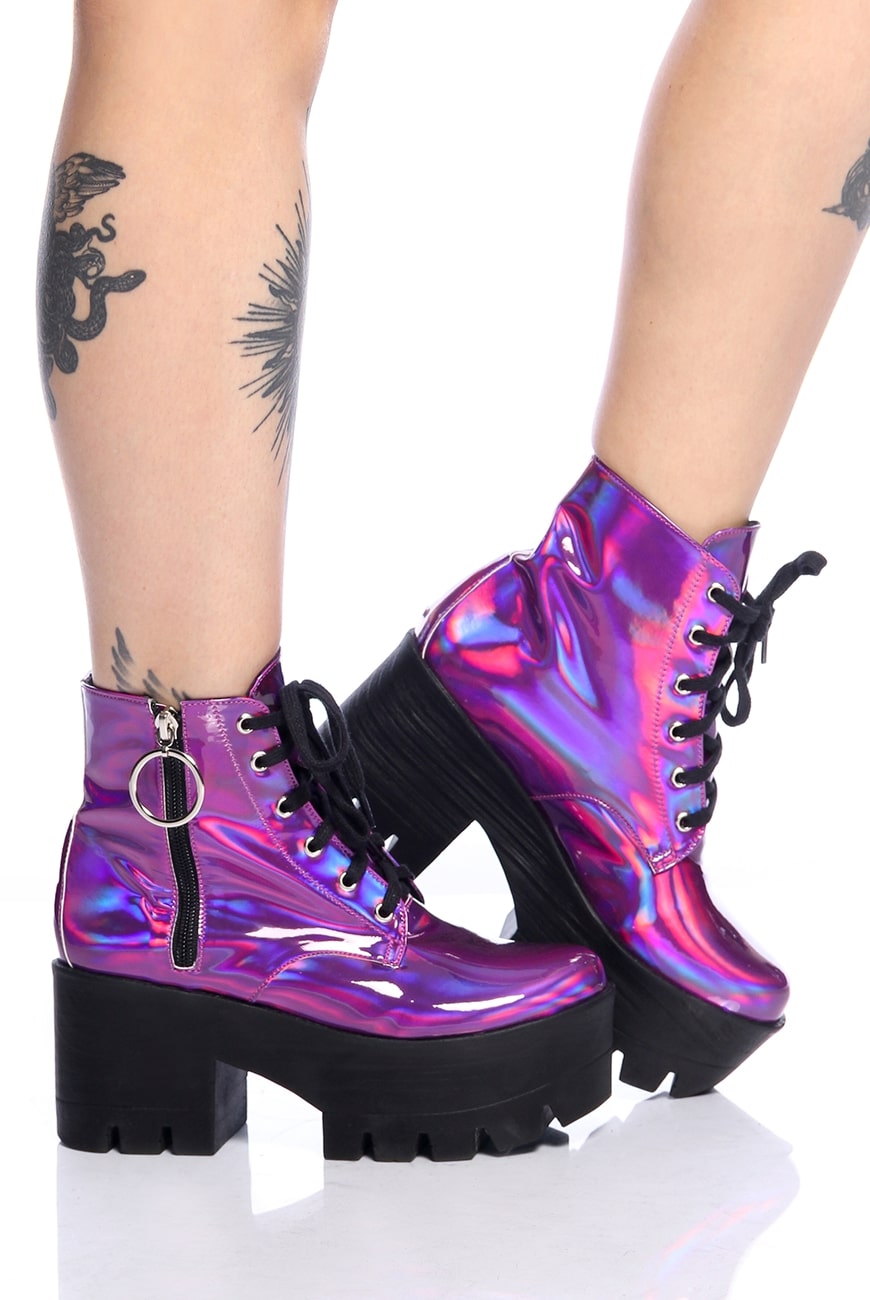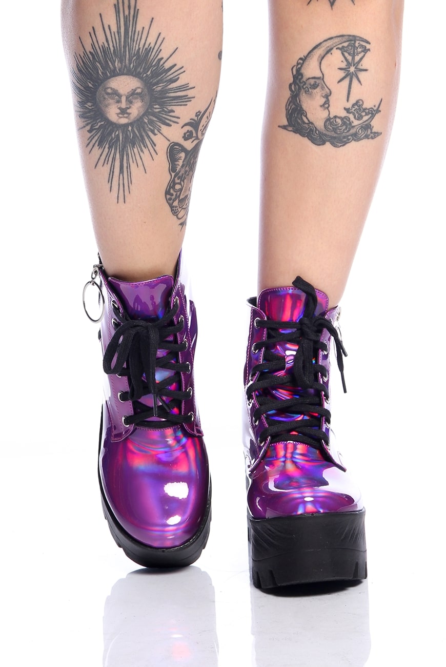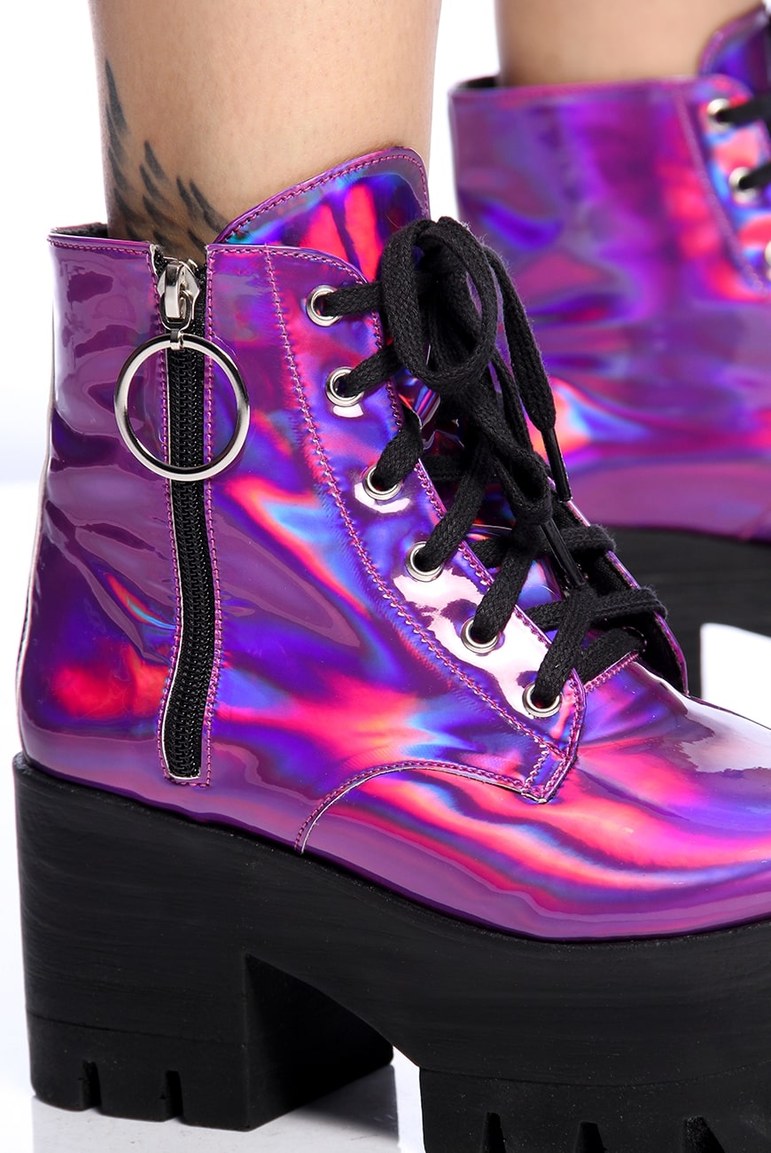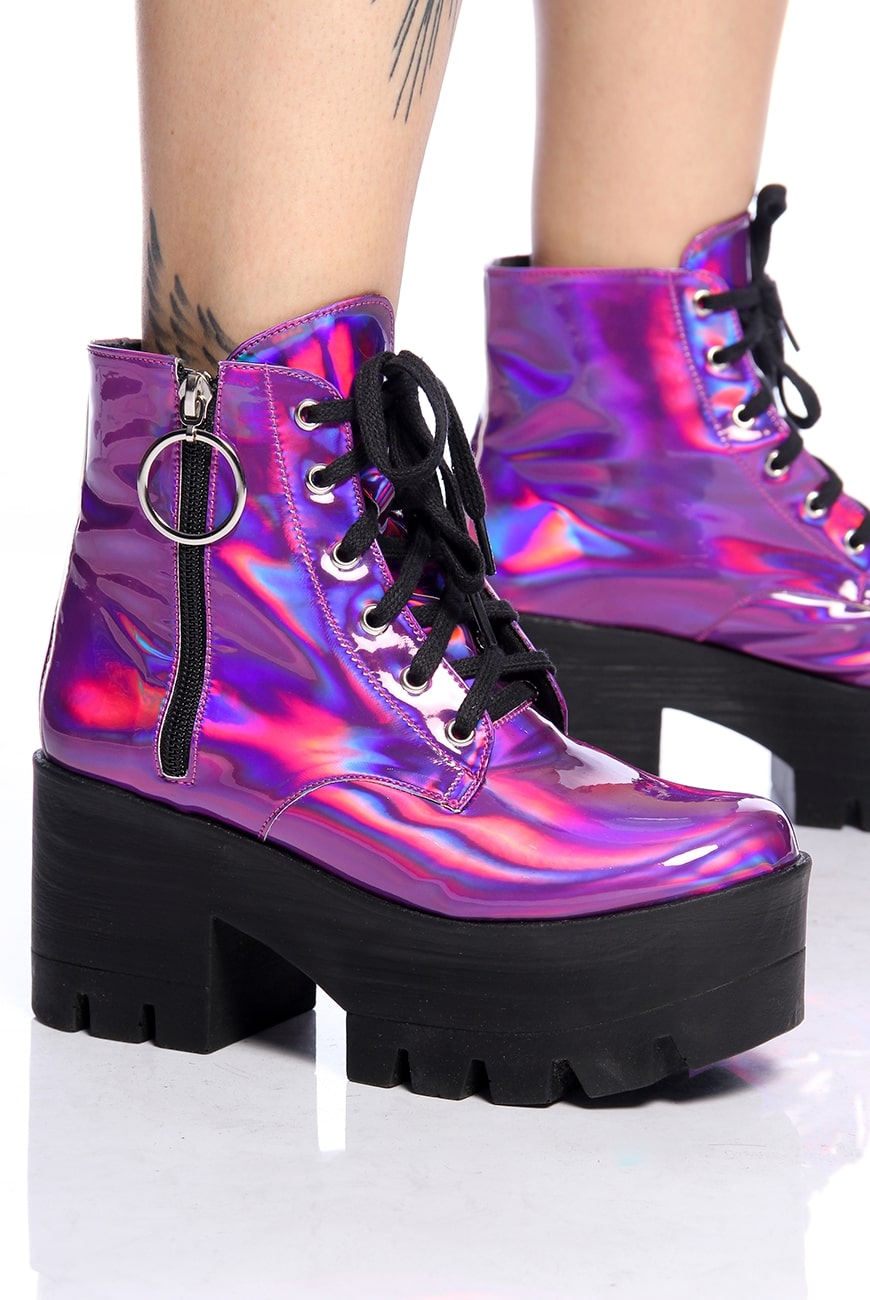 O Coturno Plataforma Holográfico Purple Haze é produzido em material holográfico roxo com um brilho envernizado super bonito e exclusivo, que não vai passar despercebido!