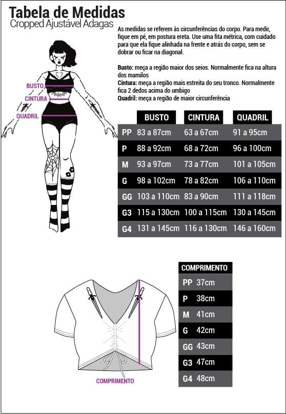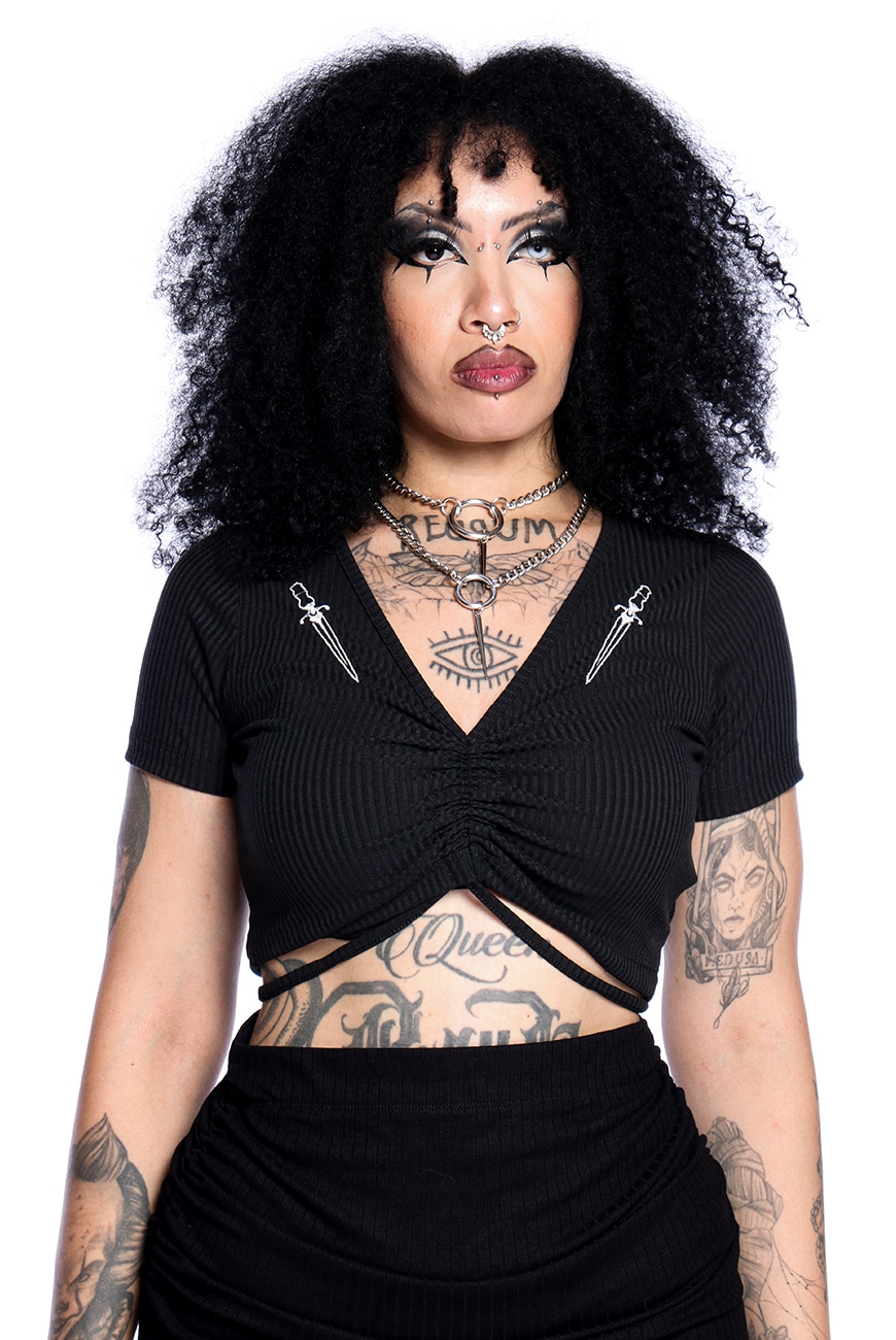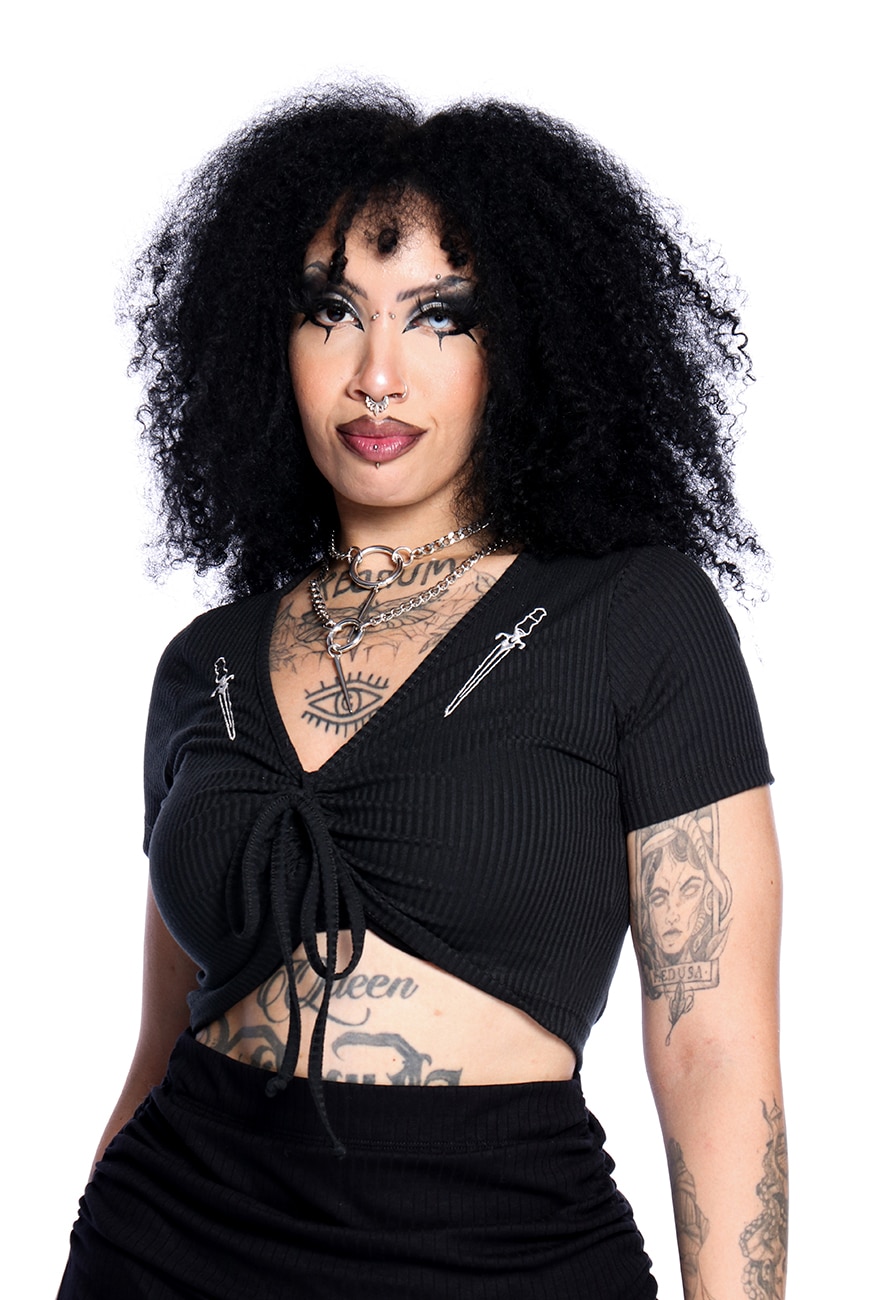 Possui manga curta e franzido na parte frontal, regulável por tiras, possibilitando diversos comprimentos e amarrações diferentes. Além disso, tem o detalhe lindíssimo de bordado de adagas no decote, deixando o modelo mais alternativo, do jeito que a gente ama!