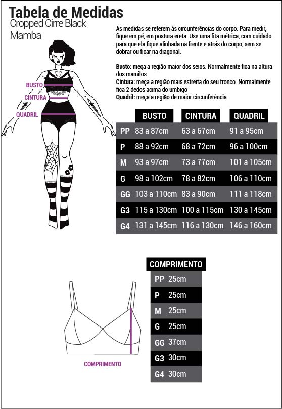 Modelo tamanho PP: Altura: 1,60m/ Cintura: 66cm/ Busto: 84cm/ Quadril: 94cm.