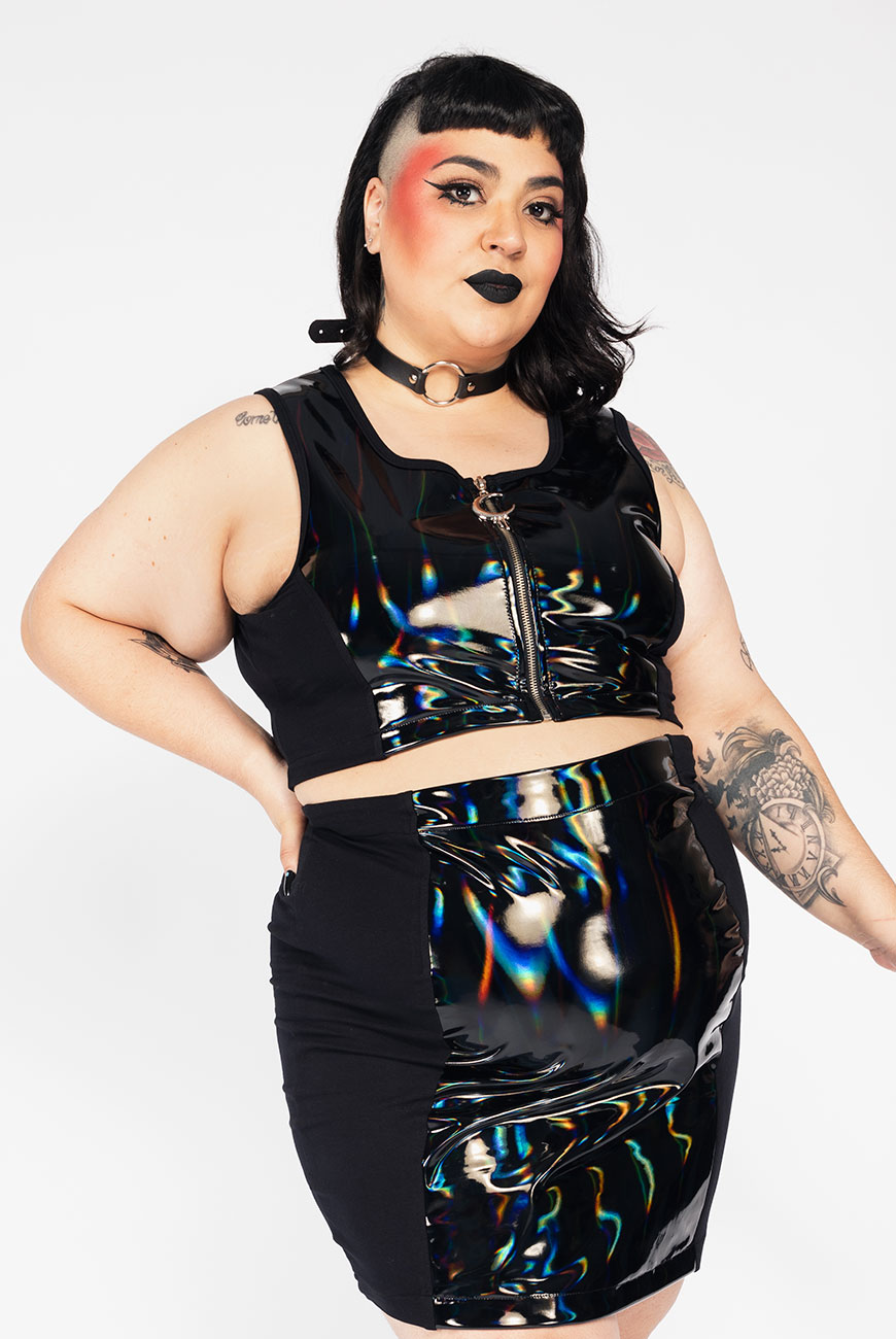 Cropped sem manga, com recorte frontal e traseiro em vinil holográfico e laterais em moletinho super macio, para maior vestibilidade e conforto. Abertura com zíper e puxador exclusivo de Lua Reversa. Para compor o look arrasador, use com a Saia Justa Cosmic Genesis.