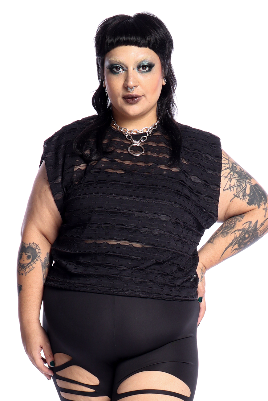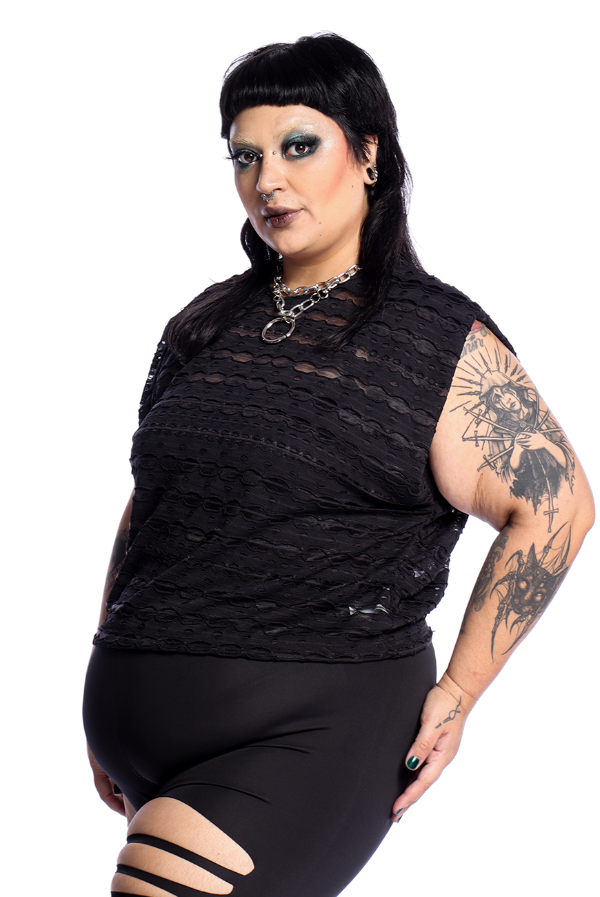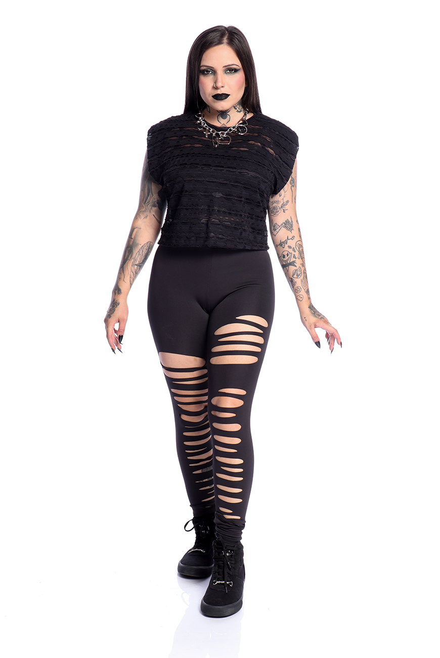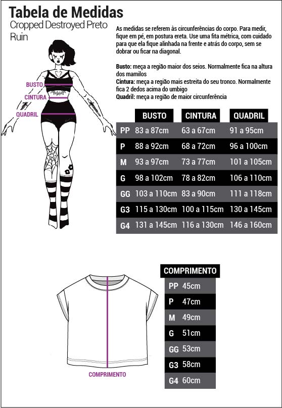 O Cropped Destroyed Preto Ruin possui modelagem mais soltinha, mangas curtas e comprimento de cropped, sendo uma peça prática e estilosa que traz essa estética dark para a sua rotina de treinos.