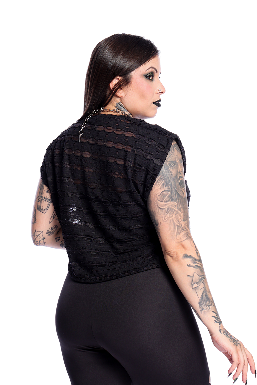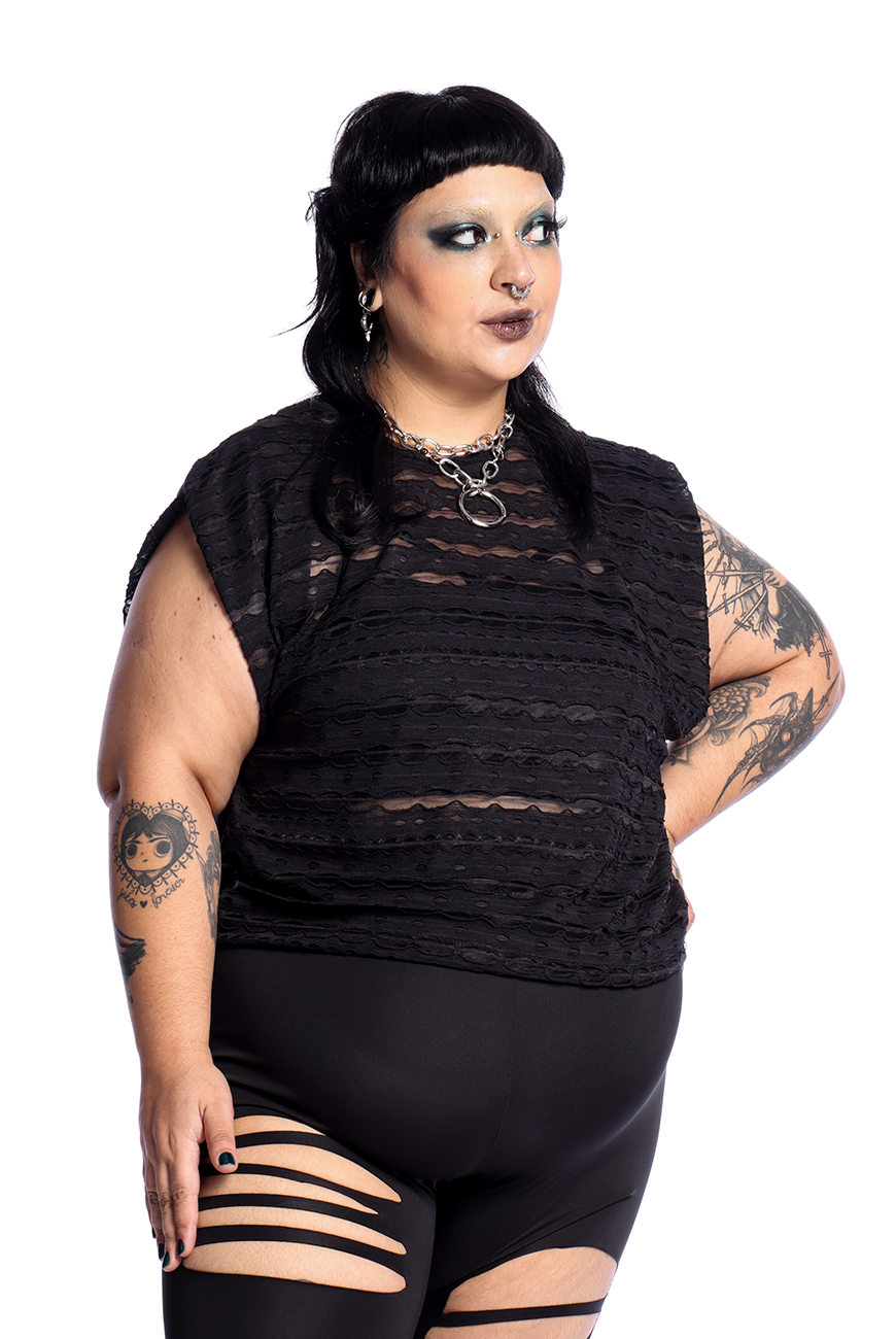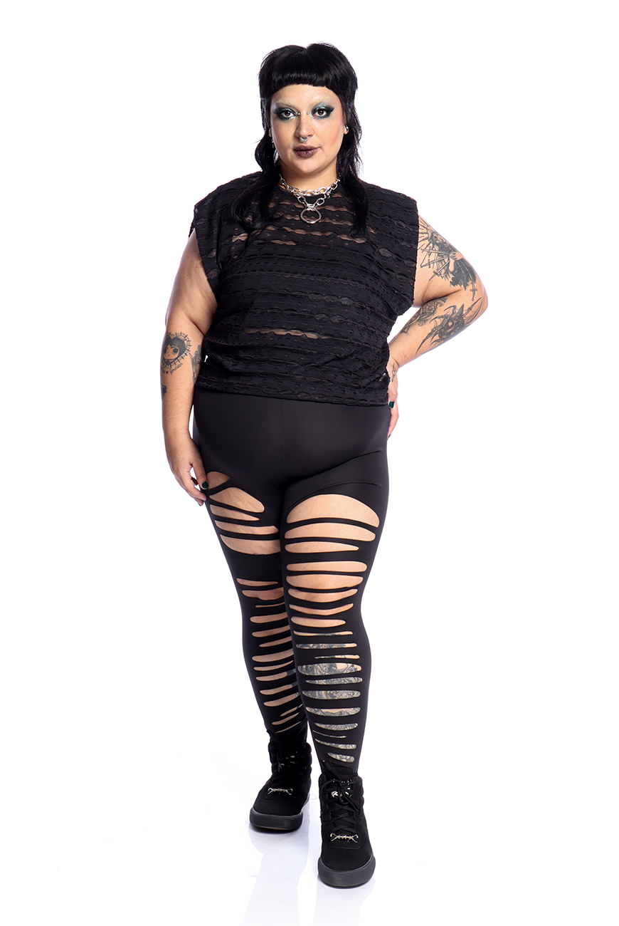 O Cropped Destroyed Preto Ruin possui modelagem mais soltinha, mangas curtas e comprimento de cropped, sendo uma peça prática e estilosa que traz essa estética dark para a sua rotina de treinos.