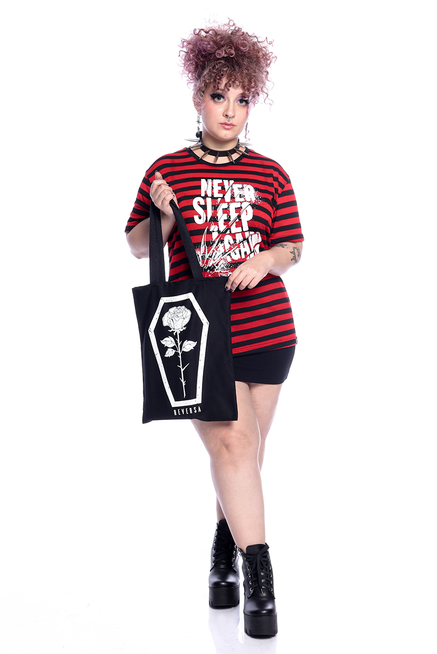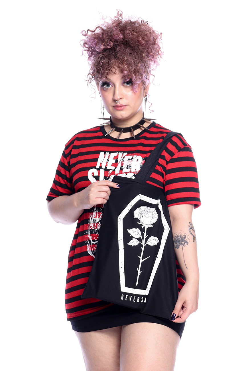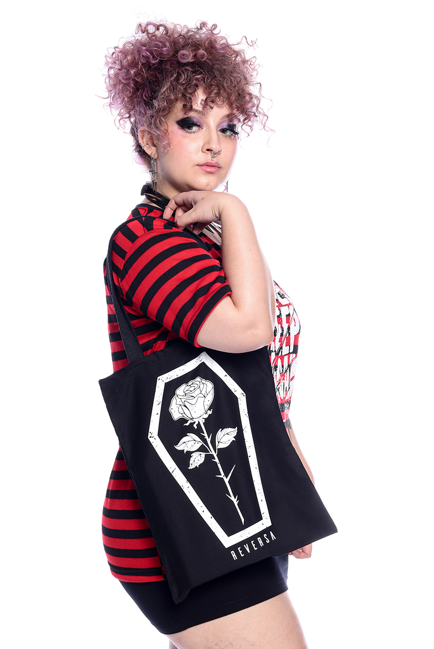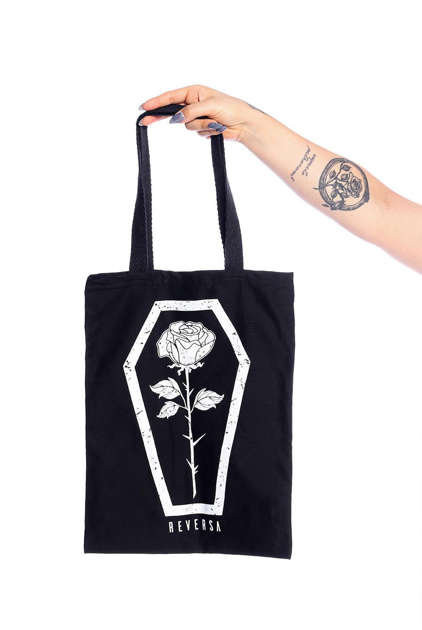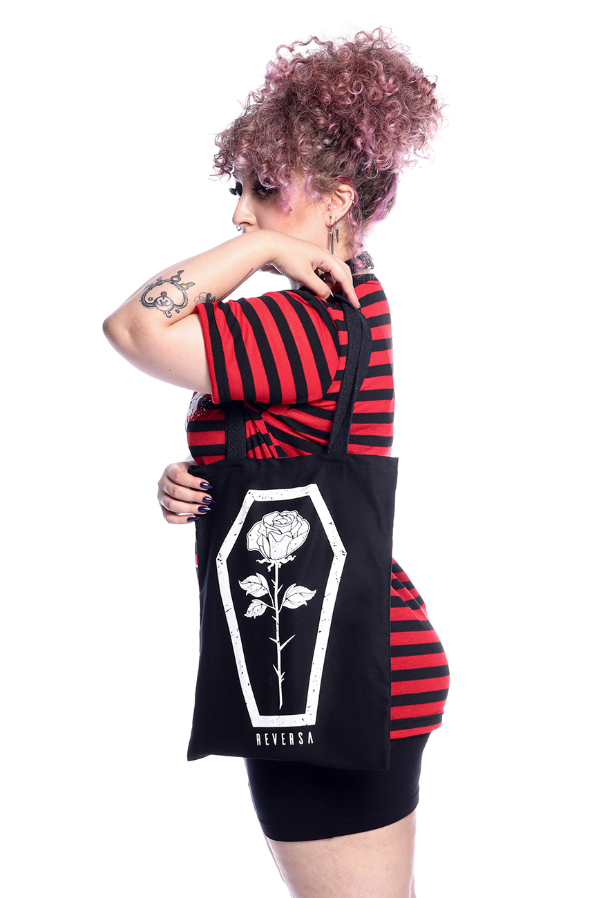 A Ecobag Caixão é produzida em algodão preto, tem alças de ombro, e nossa estampa exclusiva de caixão com rosa, bem gotiqueira!