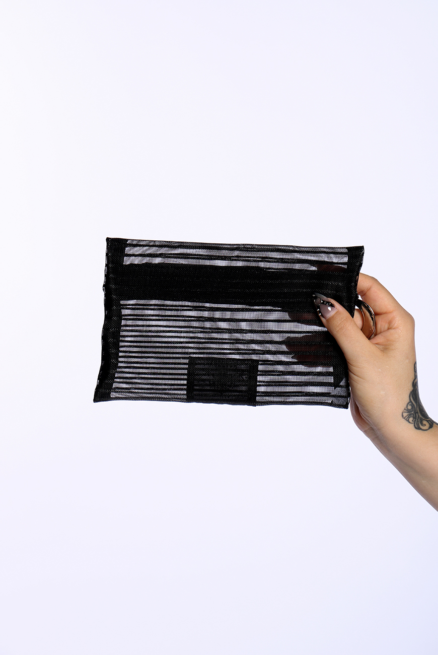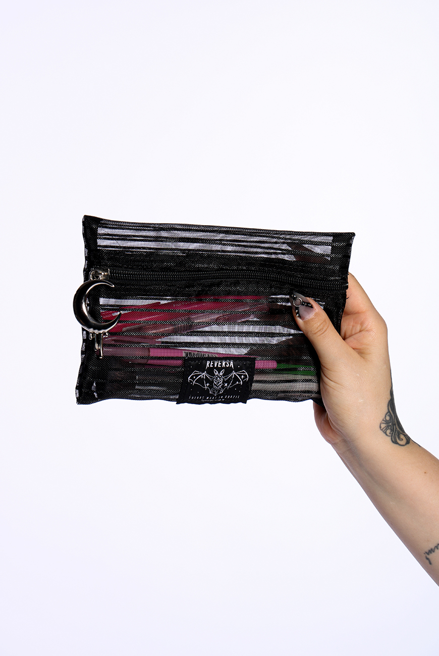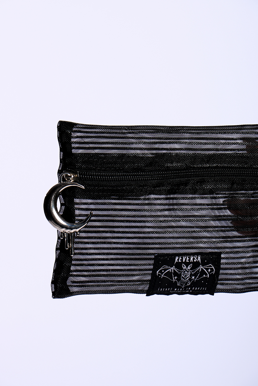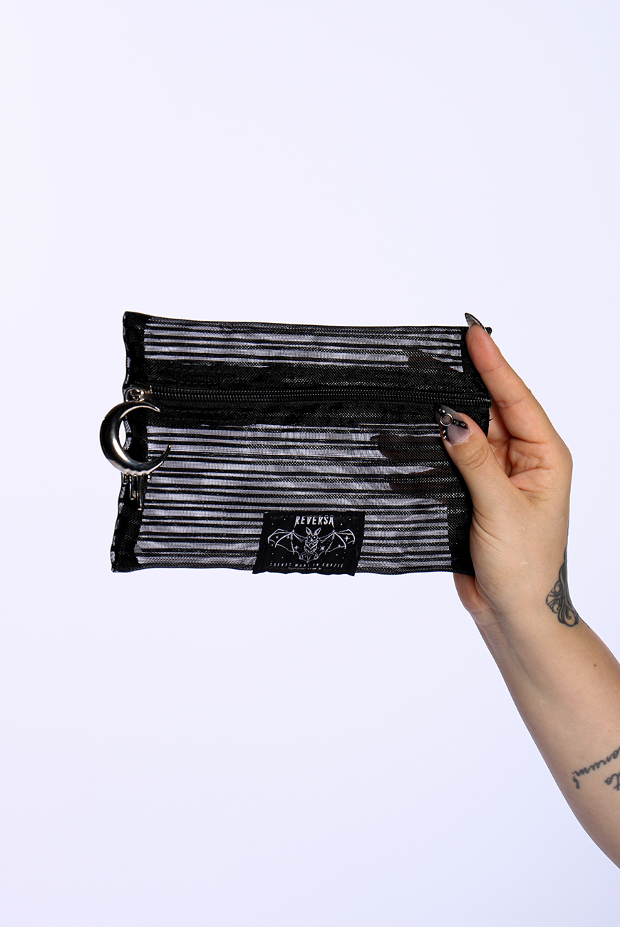 O Estojo Necessaire Stripes Preto é produzido em tela transparente na cor preta, tem nossa etiqueta super fofinha de moguerço na frente e fechamento por zíper de nylon, com nosso pingente exclusivo de lua Reversa no banho níquel. Um charme!