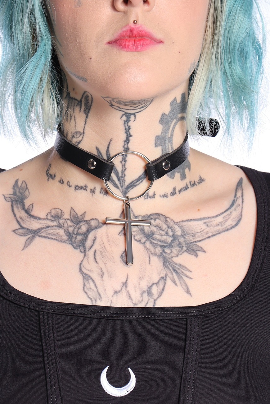 A Gargantilha Choker Cruz Hellsing é produzida em material sintético de origem não animal, com uma argola niquelada grande no centro e um pingente incrível de cruz, trazendo muito peso pro acessório.