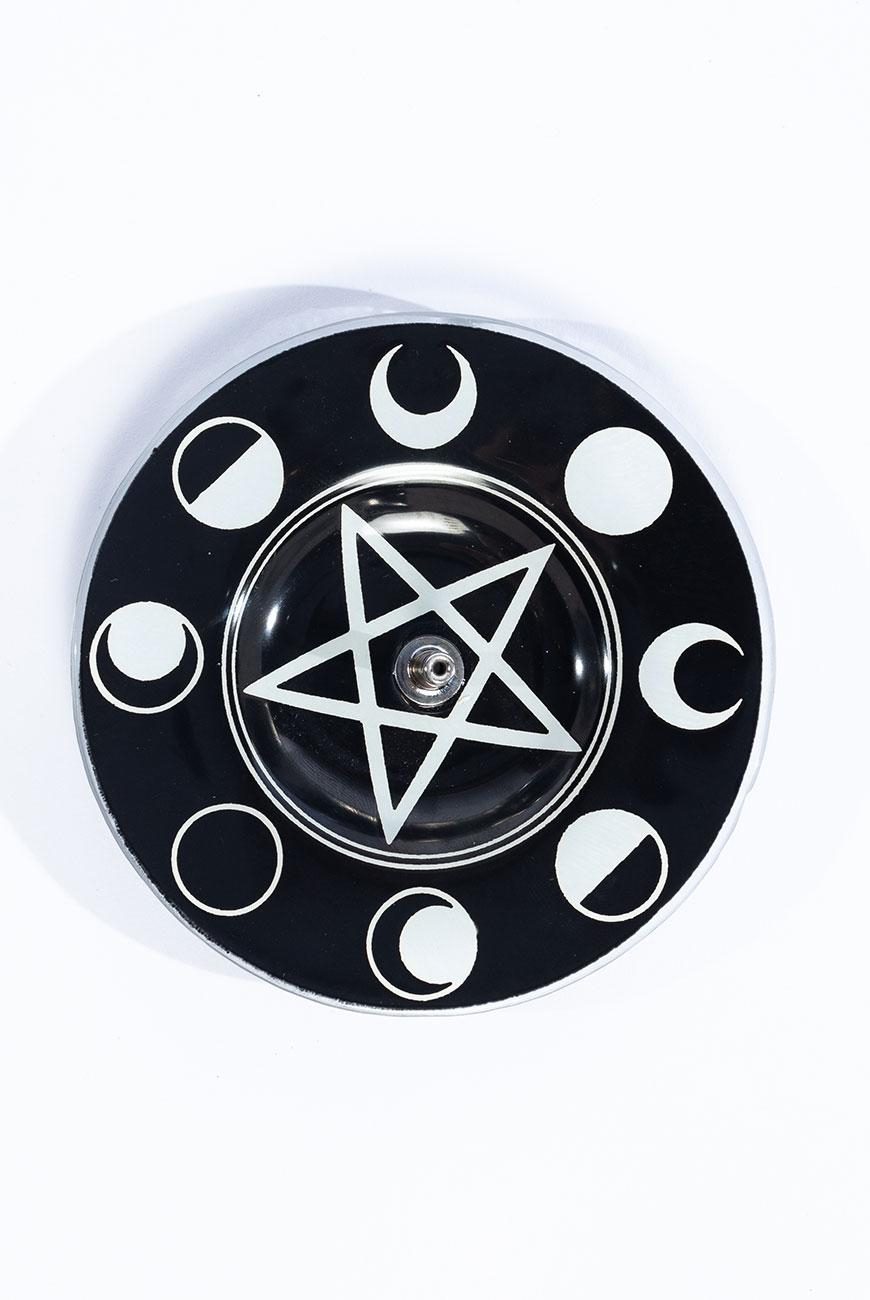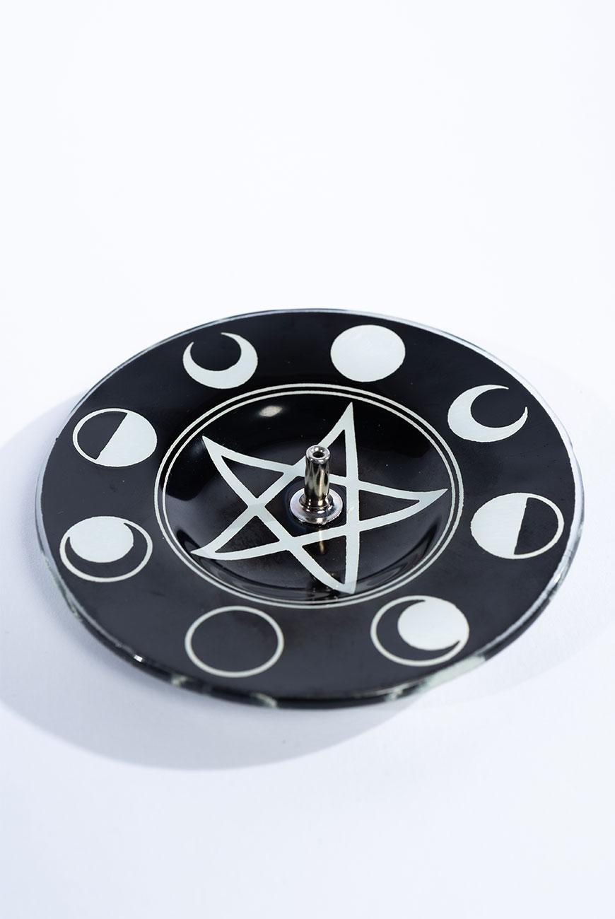 Incensário redondo produzido em vidro de alta qualidade, com apoio de metal fixado no centro e arte exclusiva de pentagrama com fases da lua.
