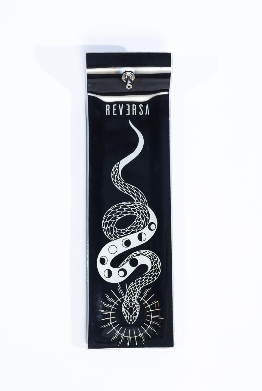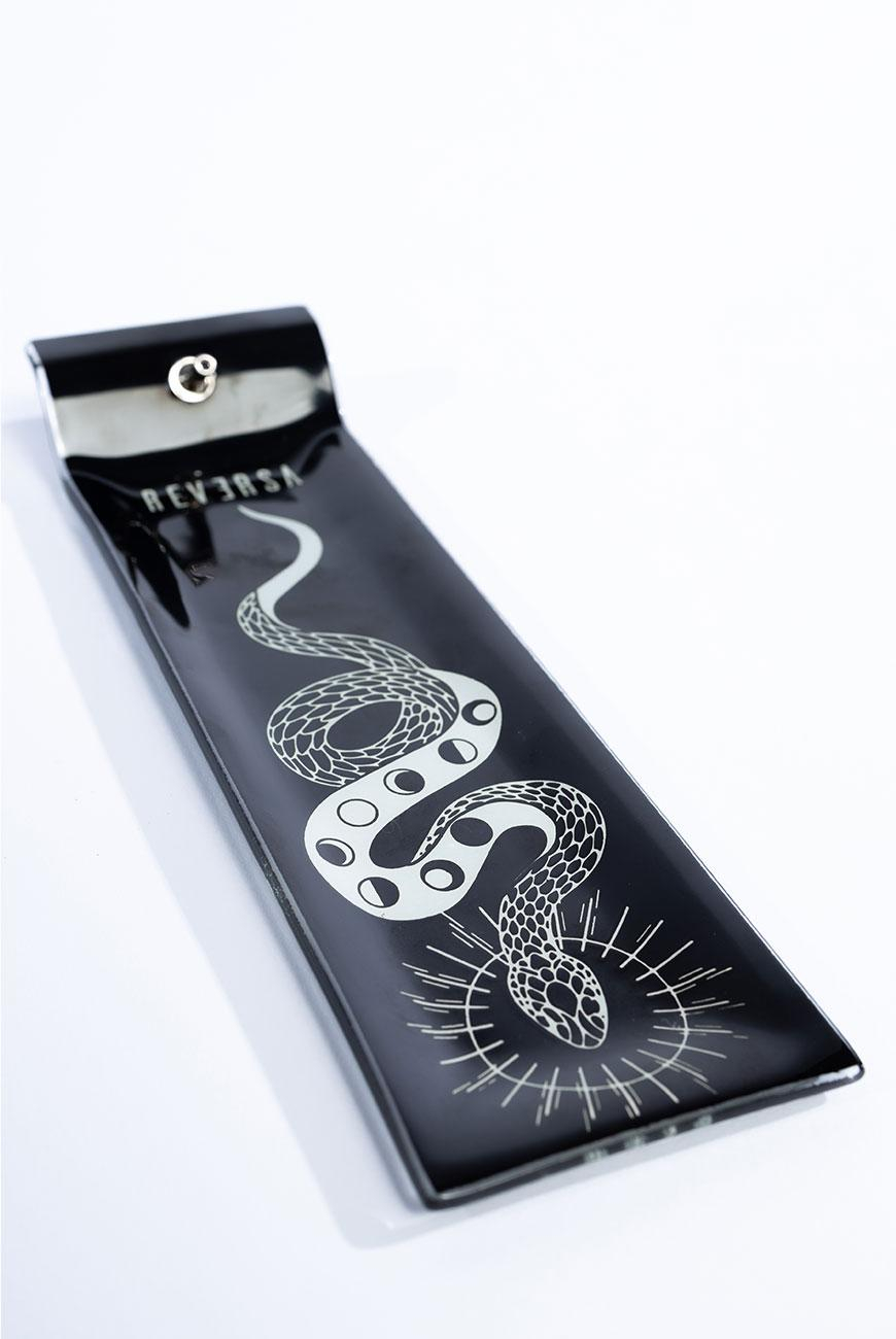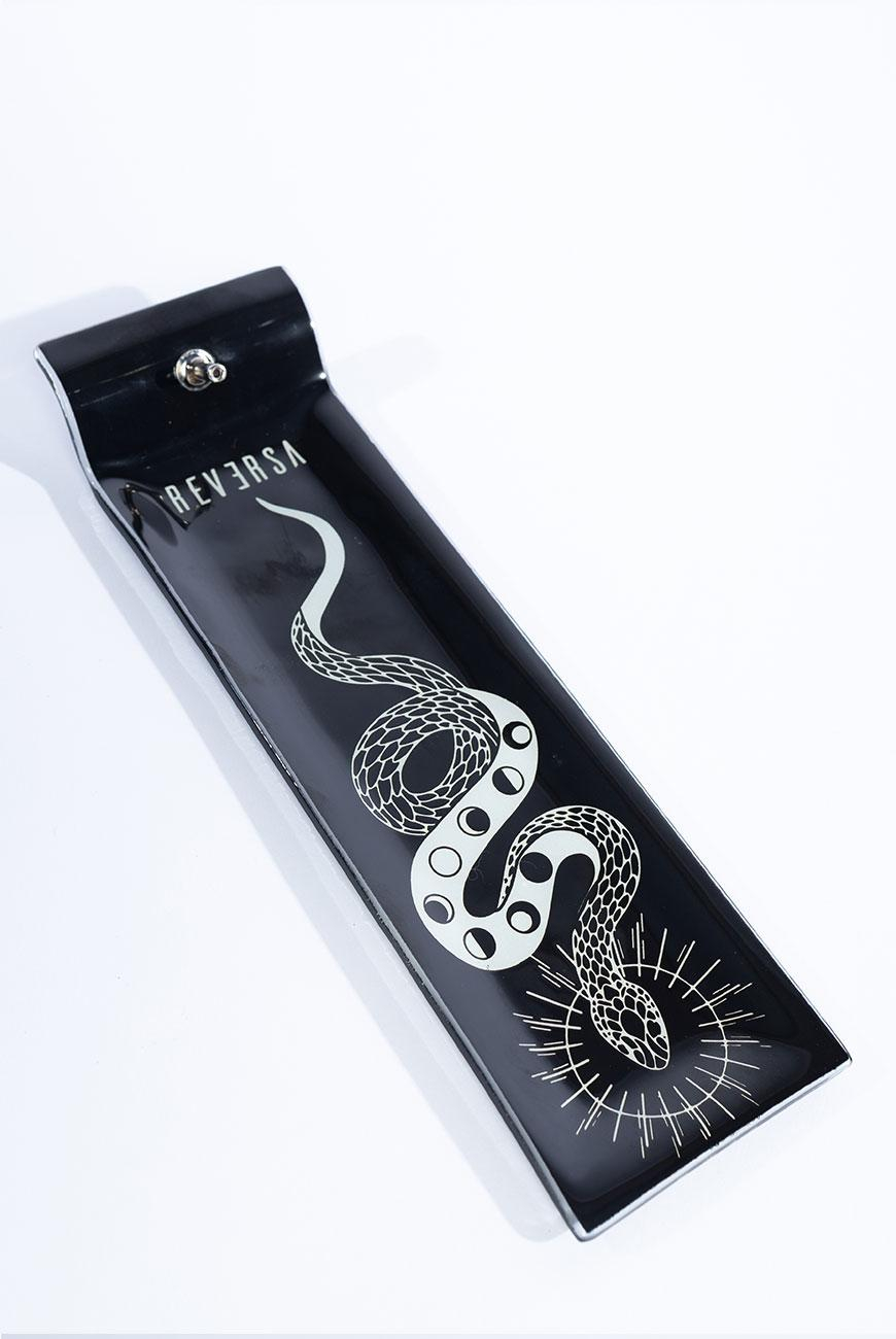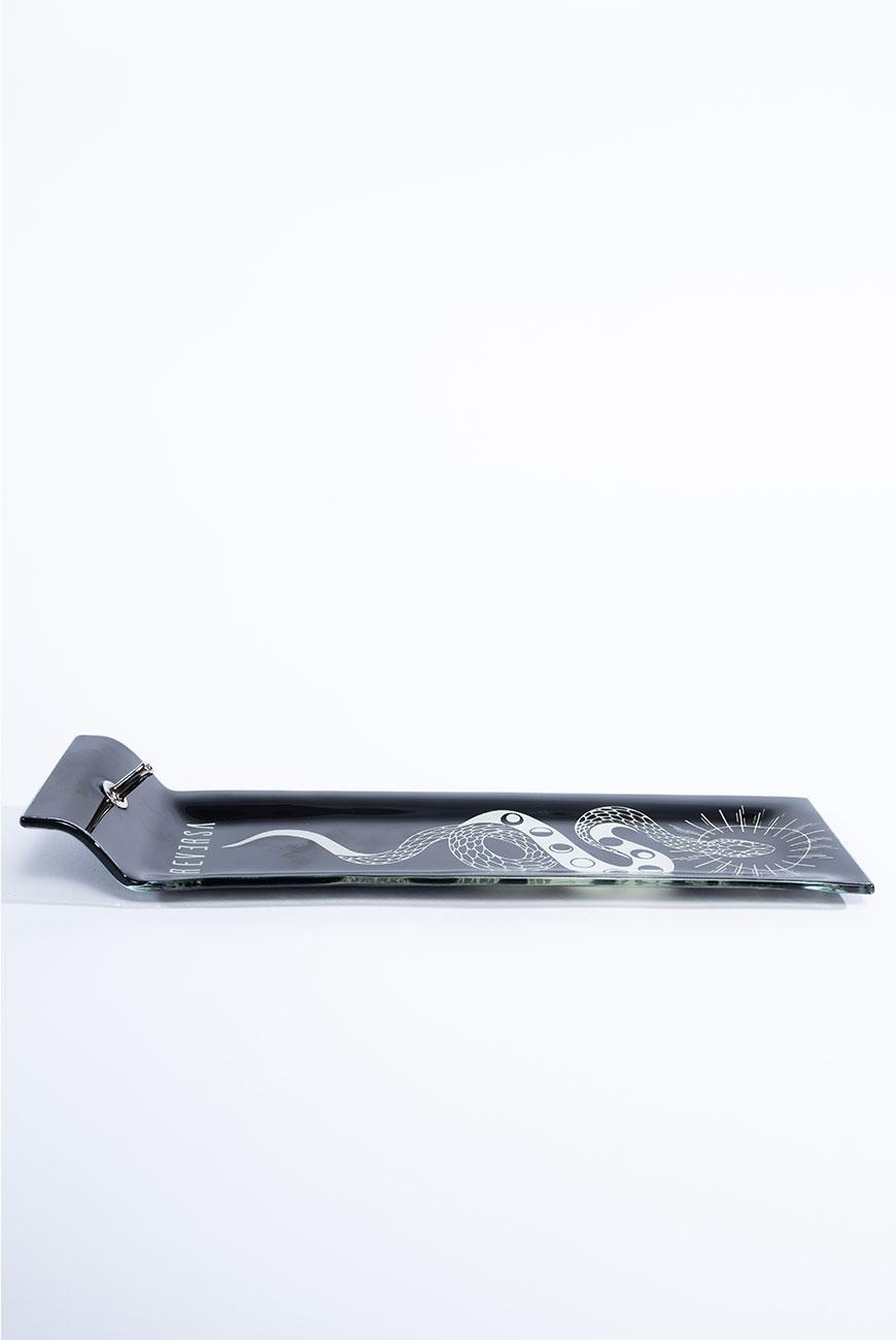 Incensário retangular produzido em vidro de alta qualidade, com apoio de metal fixado na aba superior e arte exclusiva de Serpente Mística da Reversa, para trazer aquele mood bruxiane que todas amamos.