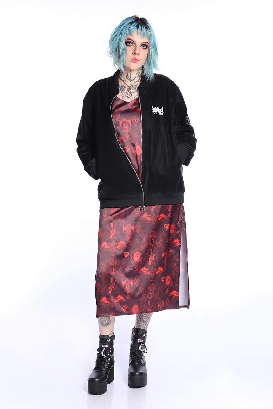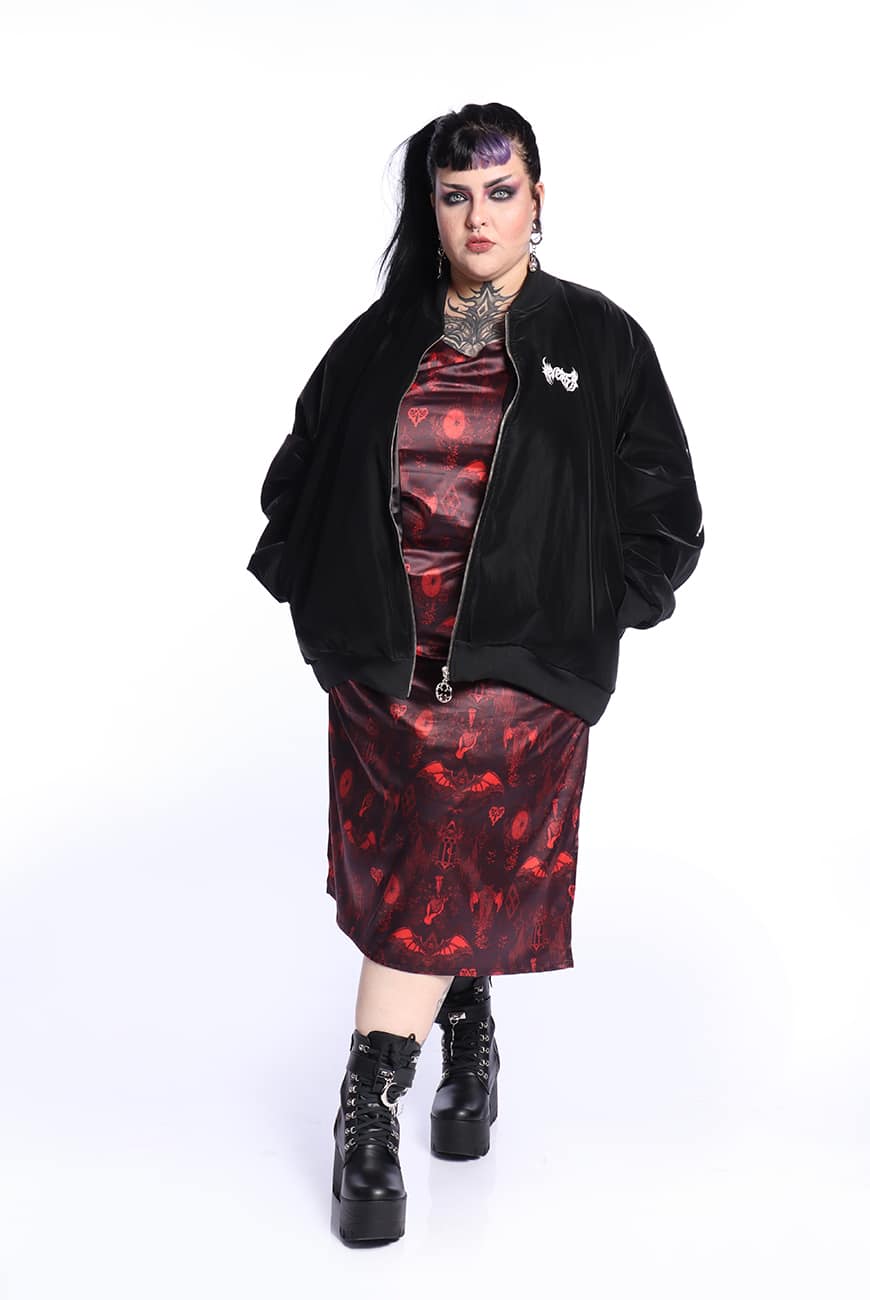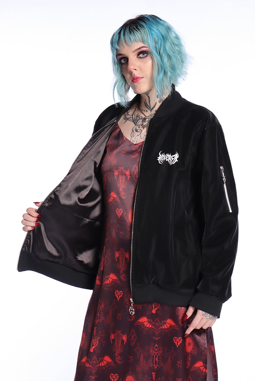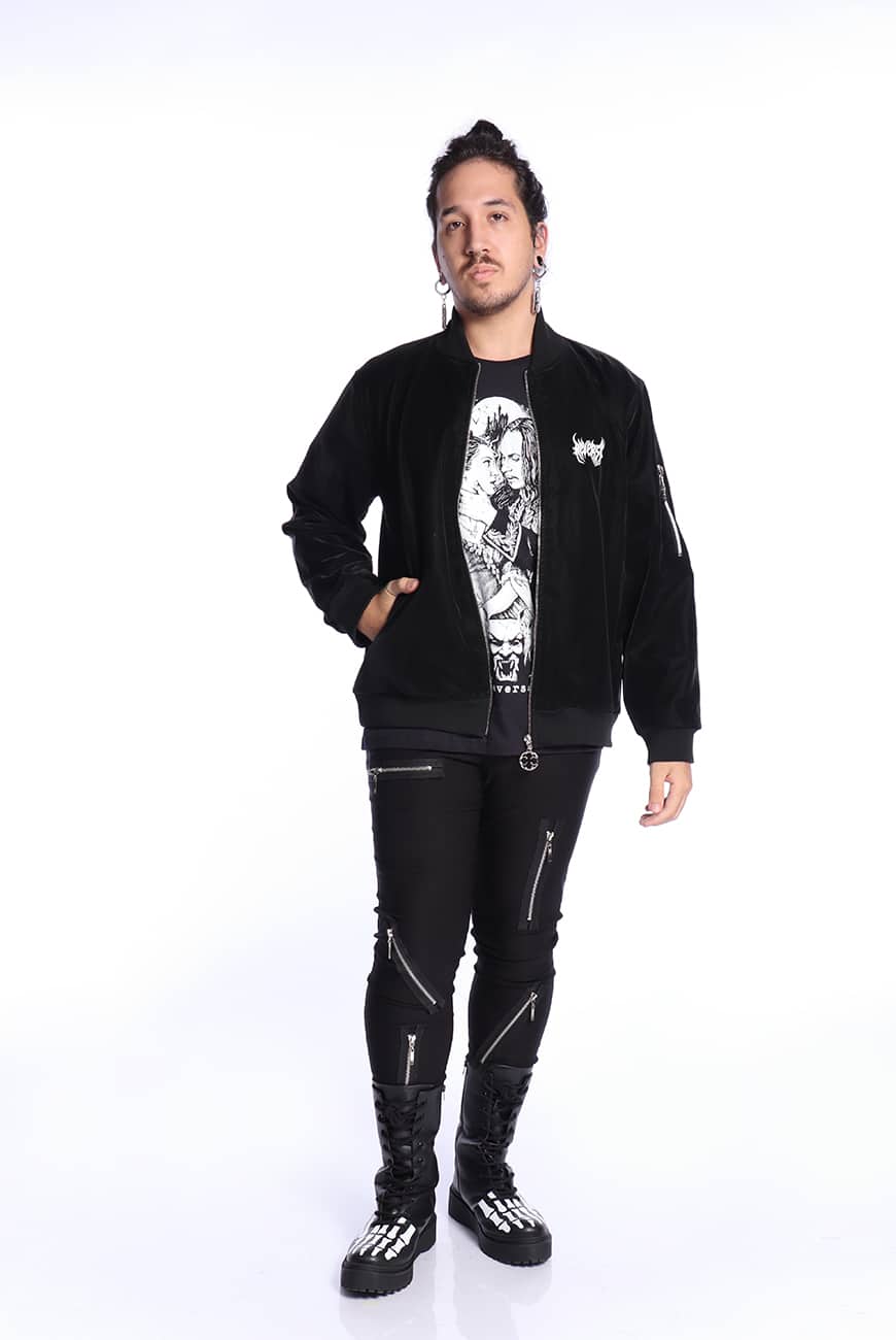 Possui fechamento por zíper de metal com nosso puxador exclusivo inspirado nas rosáceas de catedrais, trazendo esse efeito bem gótico e vampiresco que alternativo nenhum resiste. Tem bolsos laterais grandes e um bolsinho incrível na manga que também fecha por zíper, com nosso puxador exclusivo de Asa de Morcego que é um charme!