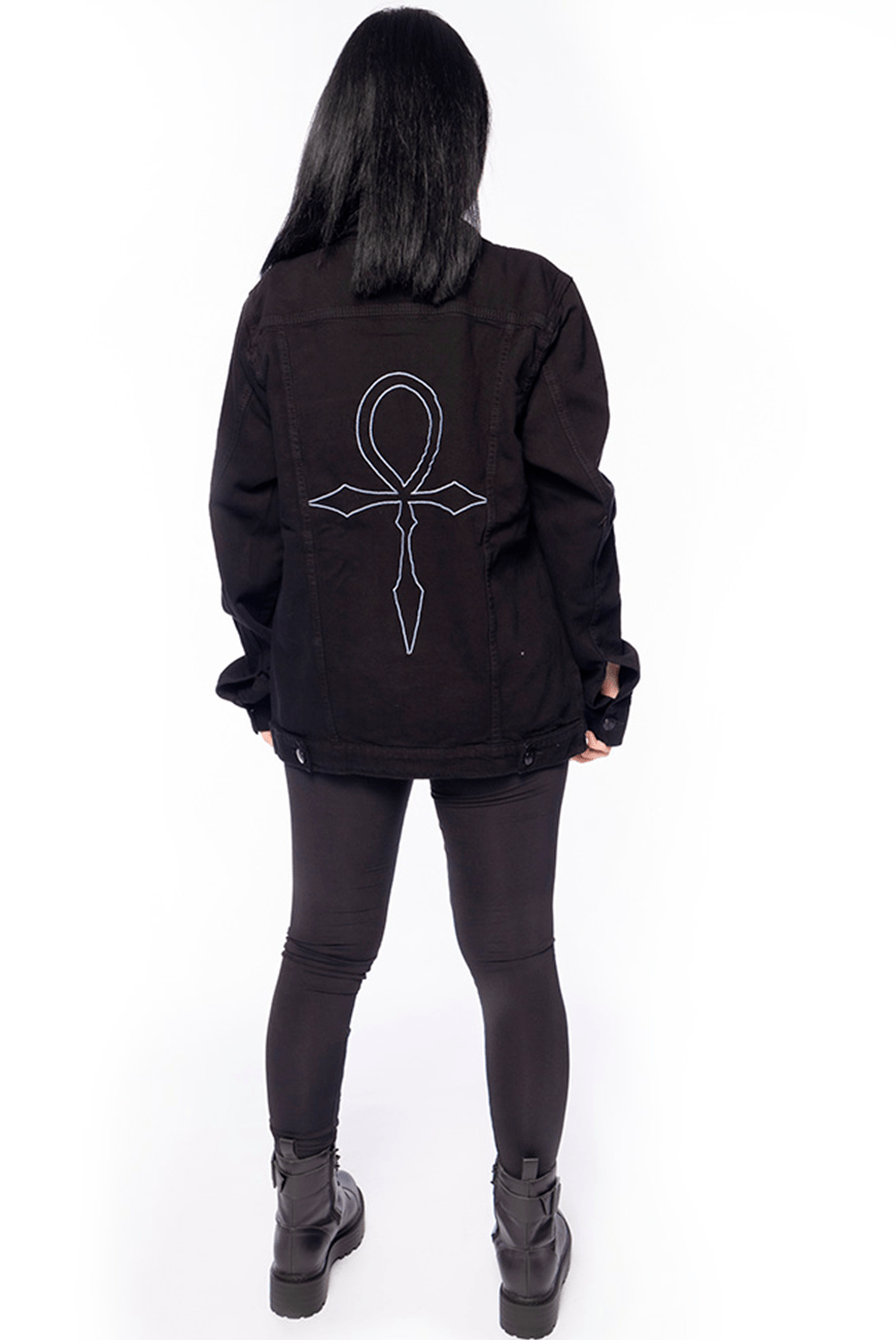 Jaqueta feita em sarja na cor preta, com comprimento oversized, ou seja, é um modelo de comprimento abaixo do quadril, feita pra ficar larguinha, e tem um exclusivo bordado de ankh na parte traseira.