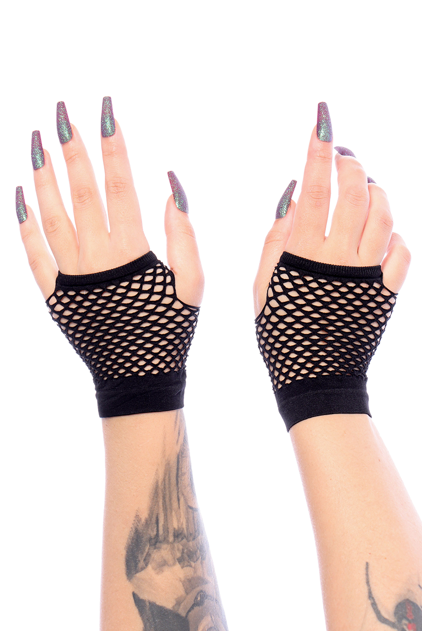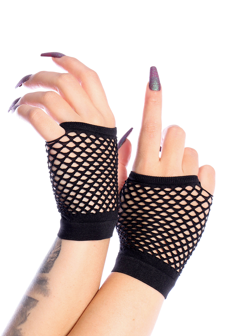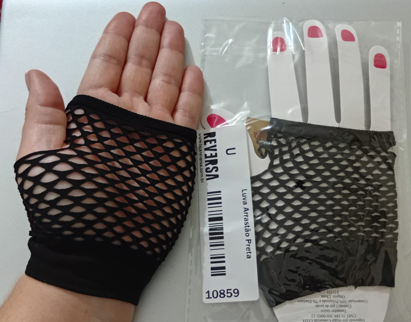 Luvas com trama de arrastão e recorte na lateral para encaixar o polegar e deixar os dedos restantes livres.