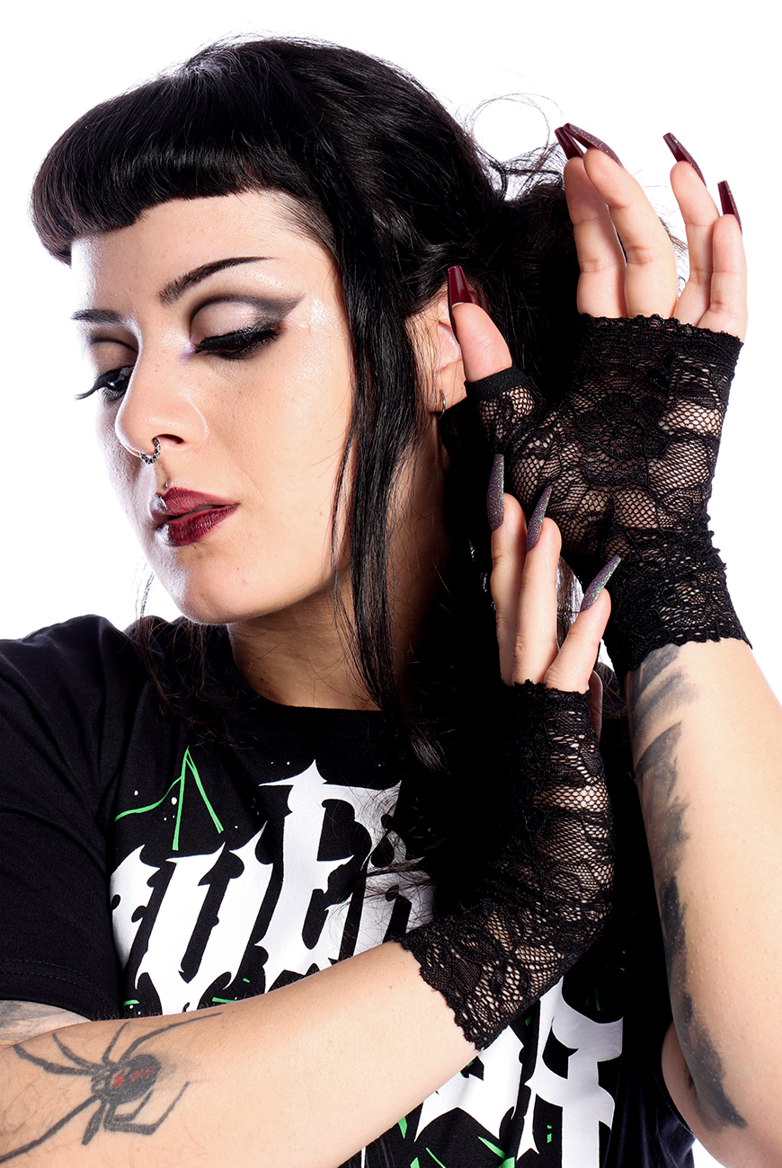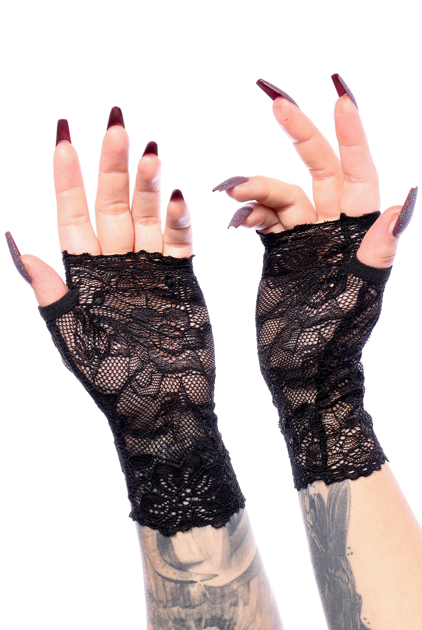 Luvas de renda com padrão floral e recorte na lateral para encaixar o polegar e deixar os dedos restantes livres.