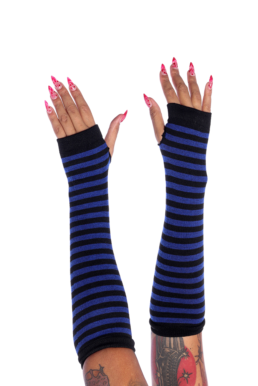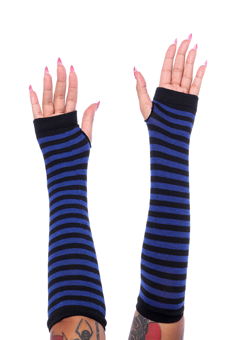 Luvas de tecido macio com listras pretas e azuis, recorte na lateral para encaixar o polegar e deixar os dedos restantes livres.