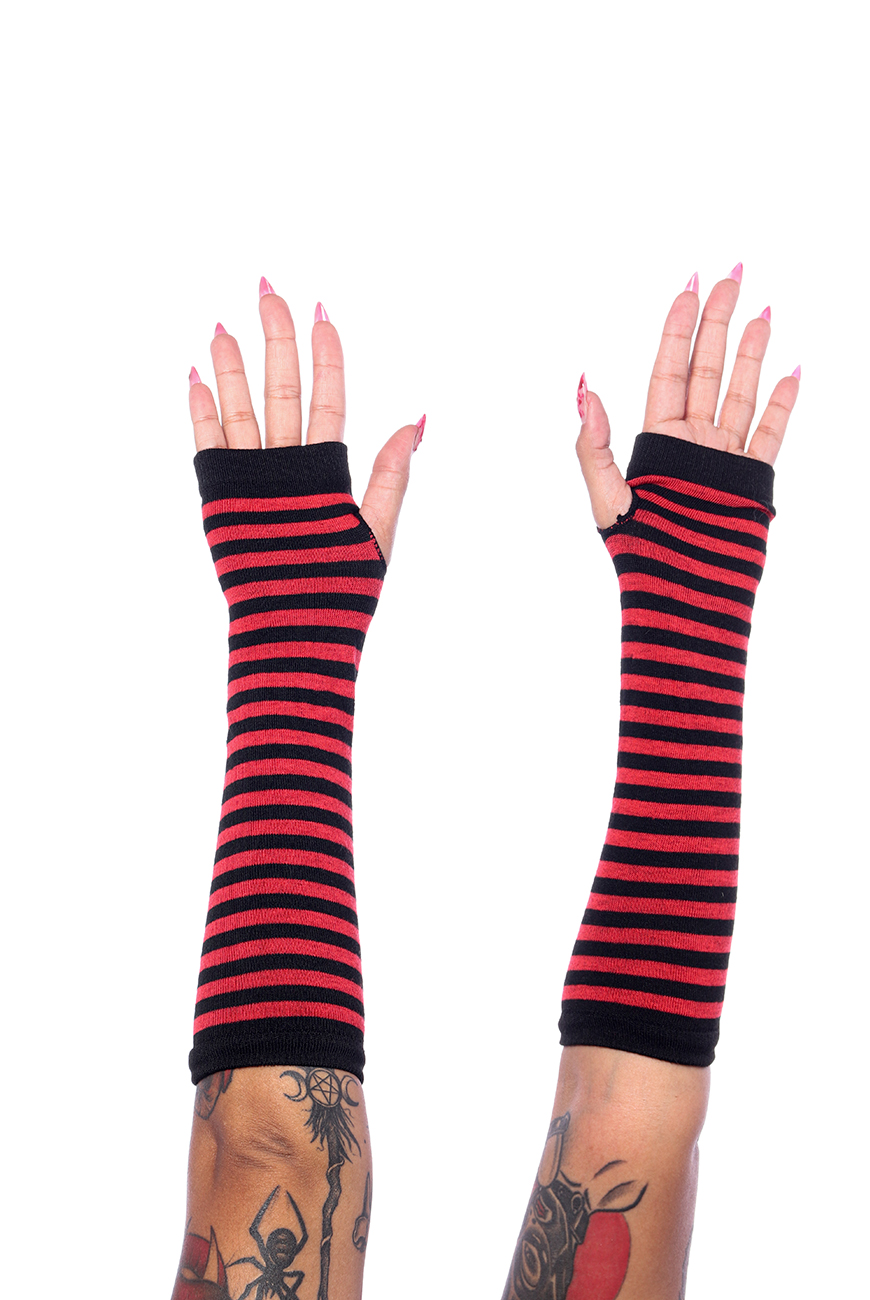 Luvas de tecido macio com listras pretas e vermelhas e recorte na lateral para encaixar o polegar e deixar os dedos restantes livres.
