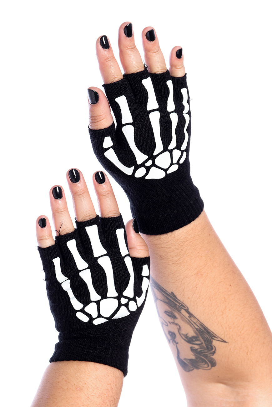 Luvas sem dedos com estampa de esqueleto, produzida em material macio e estampa emborrachada.