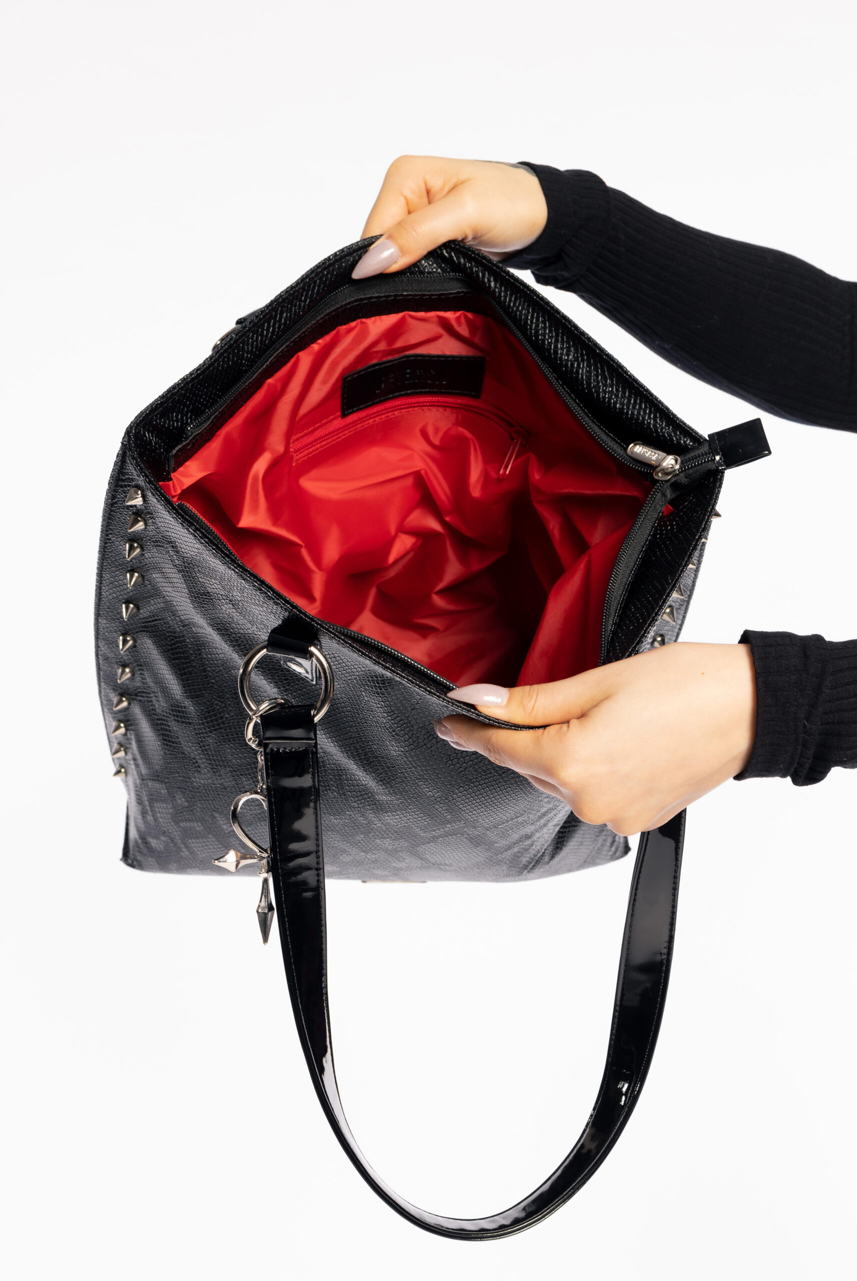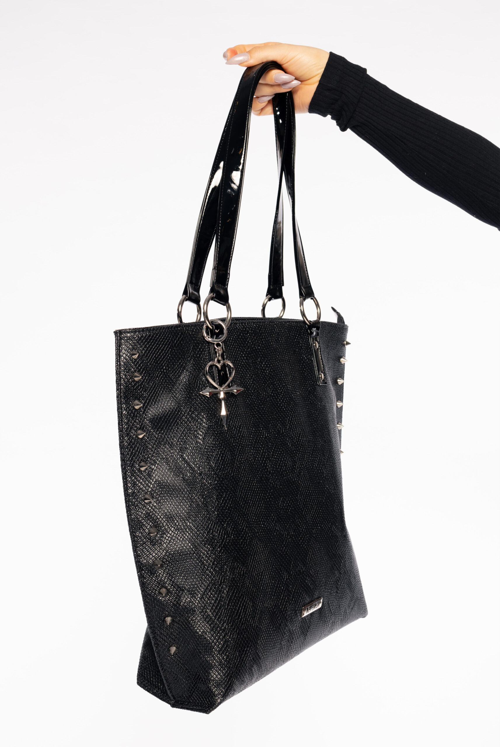 Maxi bolsa produzida em material sintético de origem não animal com textura de cobra, fechamento em zíper, spikes na frente, alças de vinil presas por argolas e mosquetão com pingente exclusivo Ankh Vampire Heart, que pode ser utilizado como chaveiro. Espaçosa, conta com forro acetinado vermelho e bolso interno com zíper, para carregar o essencial e muito mais. Perfeita para compor o look que vai petrificar quem te olha!