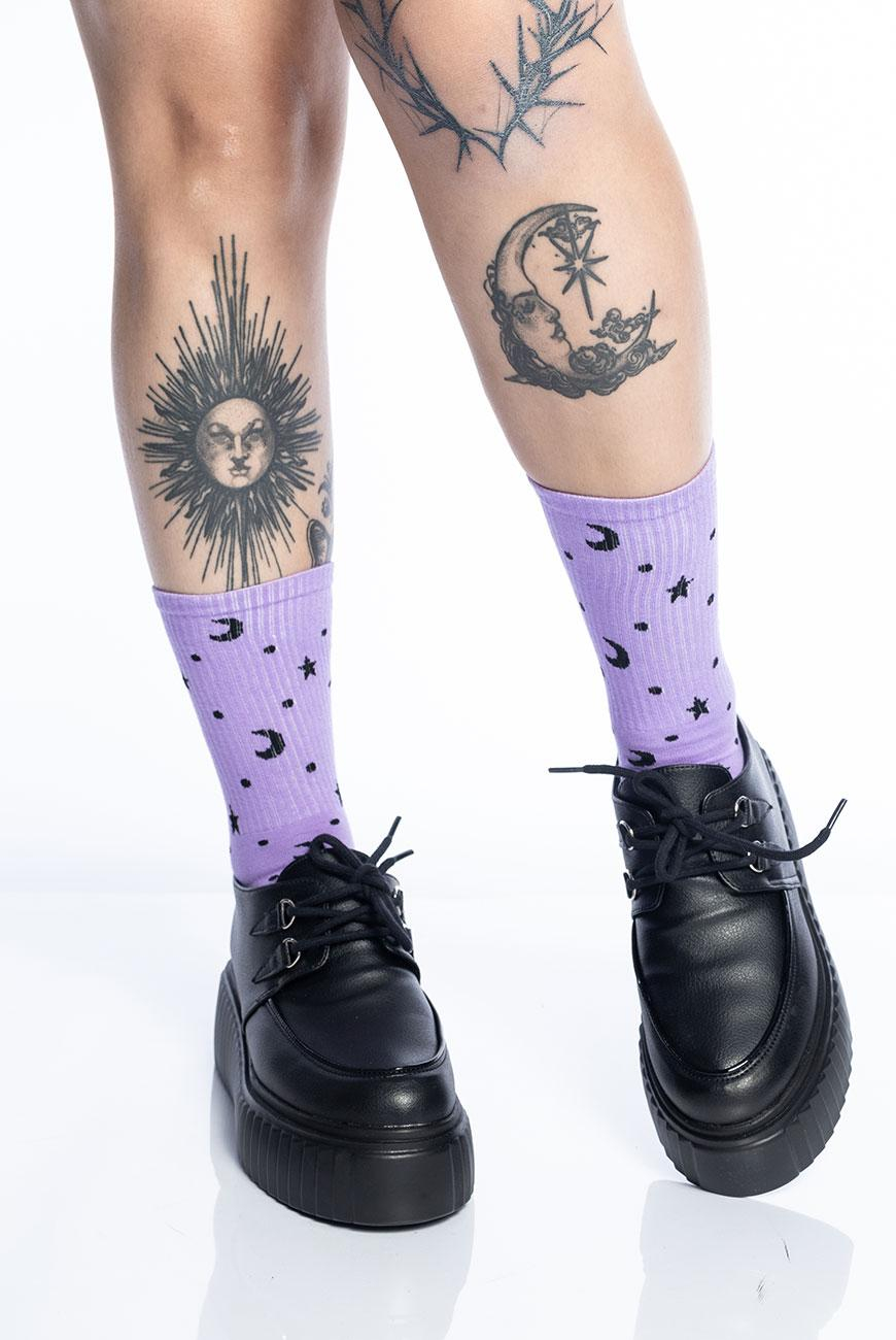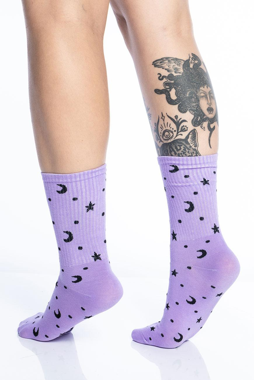 Meia cano médio com design de lua e estrelas em jacquard, perfeita para você fazer as suas magias com estilo e fofura!