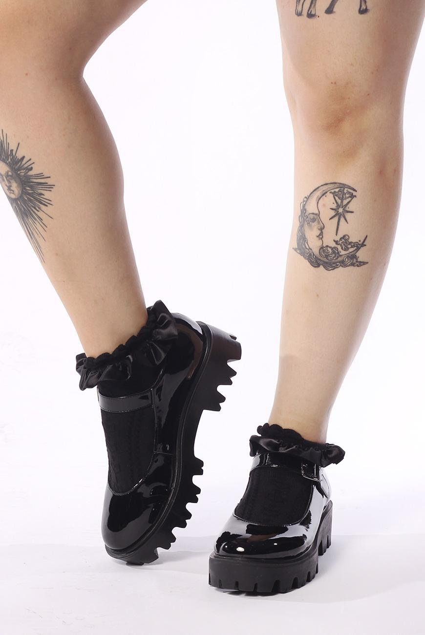 Meia soquete preta com textura de corações em jacquard e detalhe de babados em cetim.