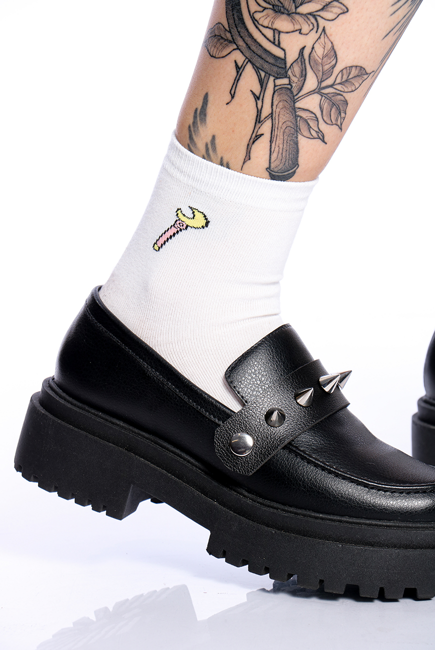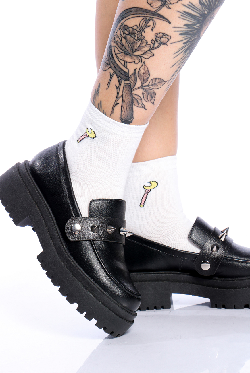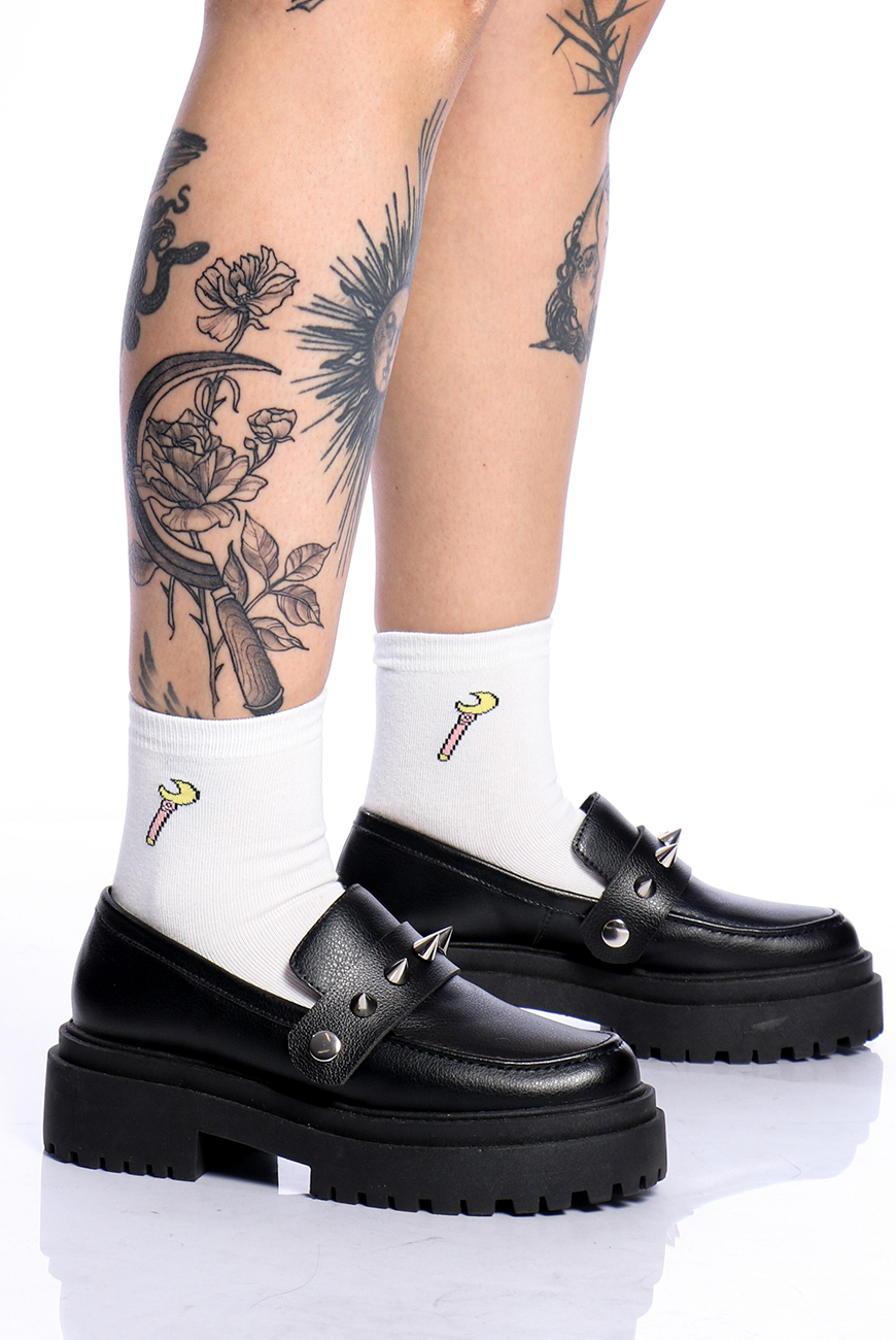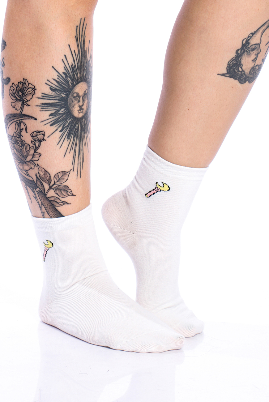 A Meia Soquete Branca Cetro Lunar tem cano médio, é produzida em acrílico com design em jacquard de cetro lunar.
