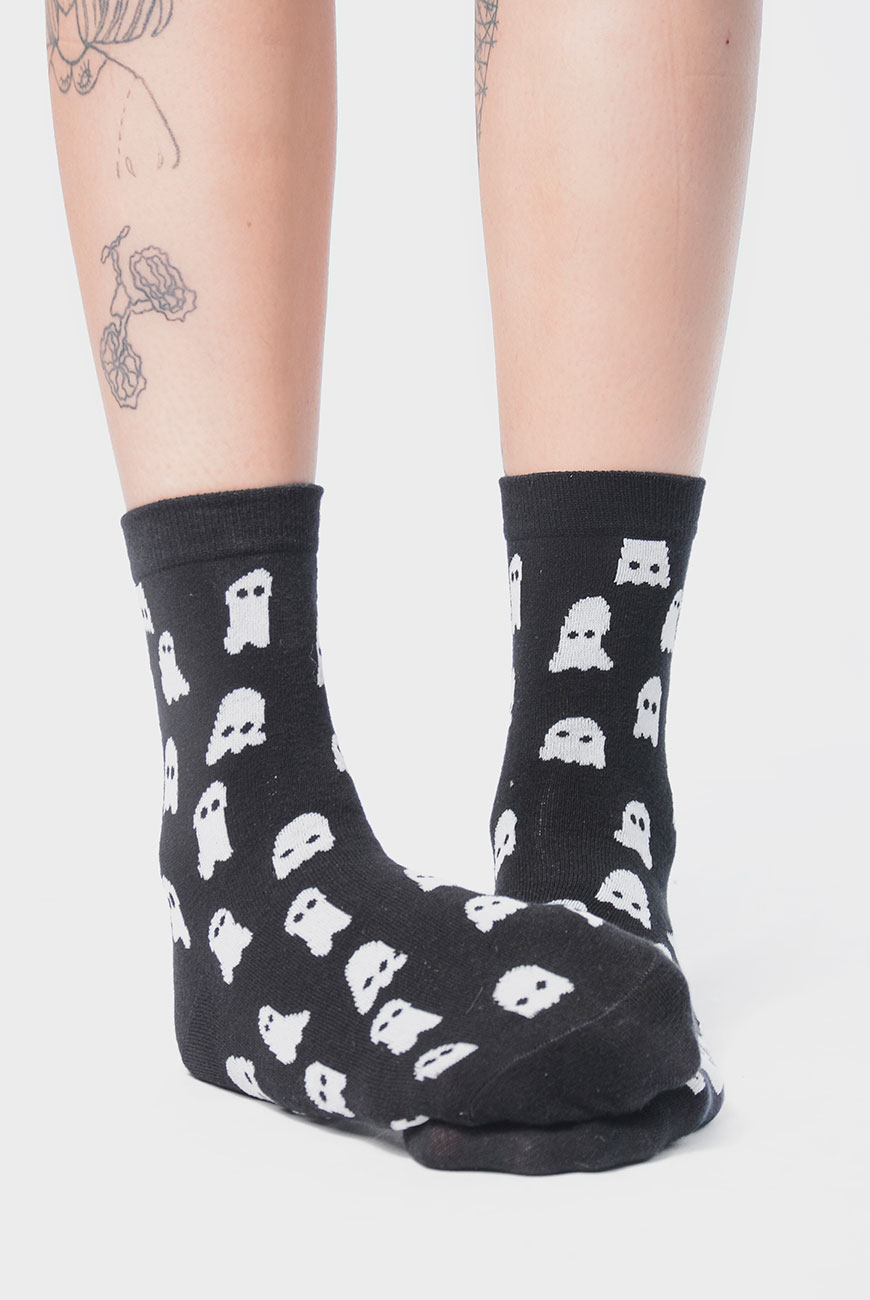 Meia soquete cano alto em acrílico com design de fantasminhas fofos em jacquard. Material macio e confortável. Tamanho único, serve do 34 ao 44.