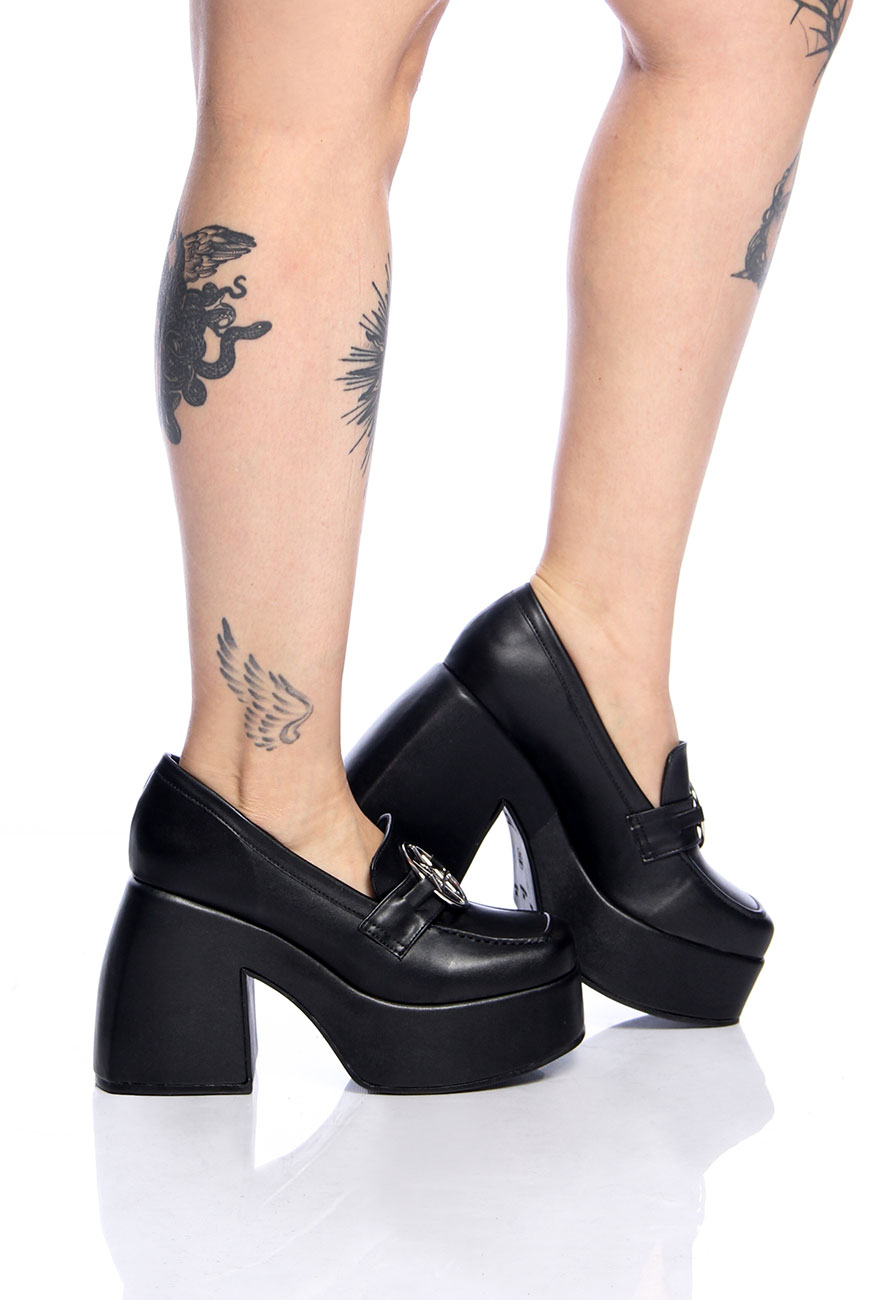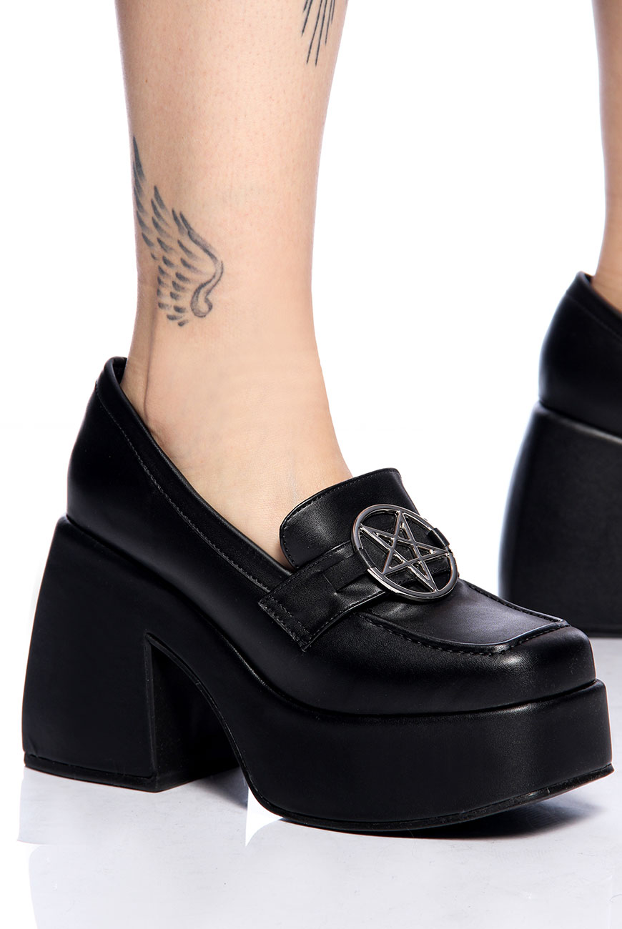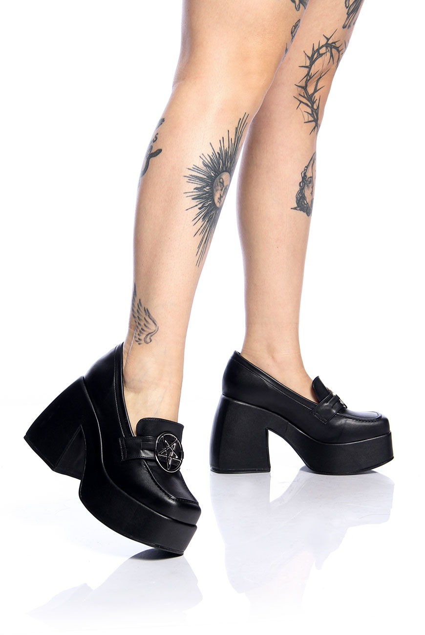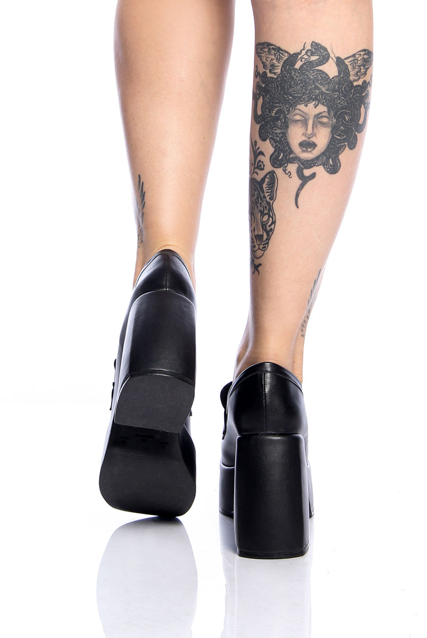 O Mocassim Meia Pata Pentagrama Invertido é edição limitada e exclusivíssimo da Reversa. Produzido em um material super macio e confortável, com salto grosso e plataforma na frente para mais estabilidade, além do detalhe mais incrível de todos: um pentagrama invertido de metal no banho níquel, fixado na parte da frente, pra trevosa nenhuma botar defeito!