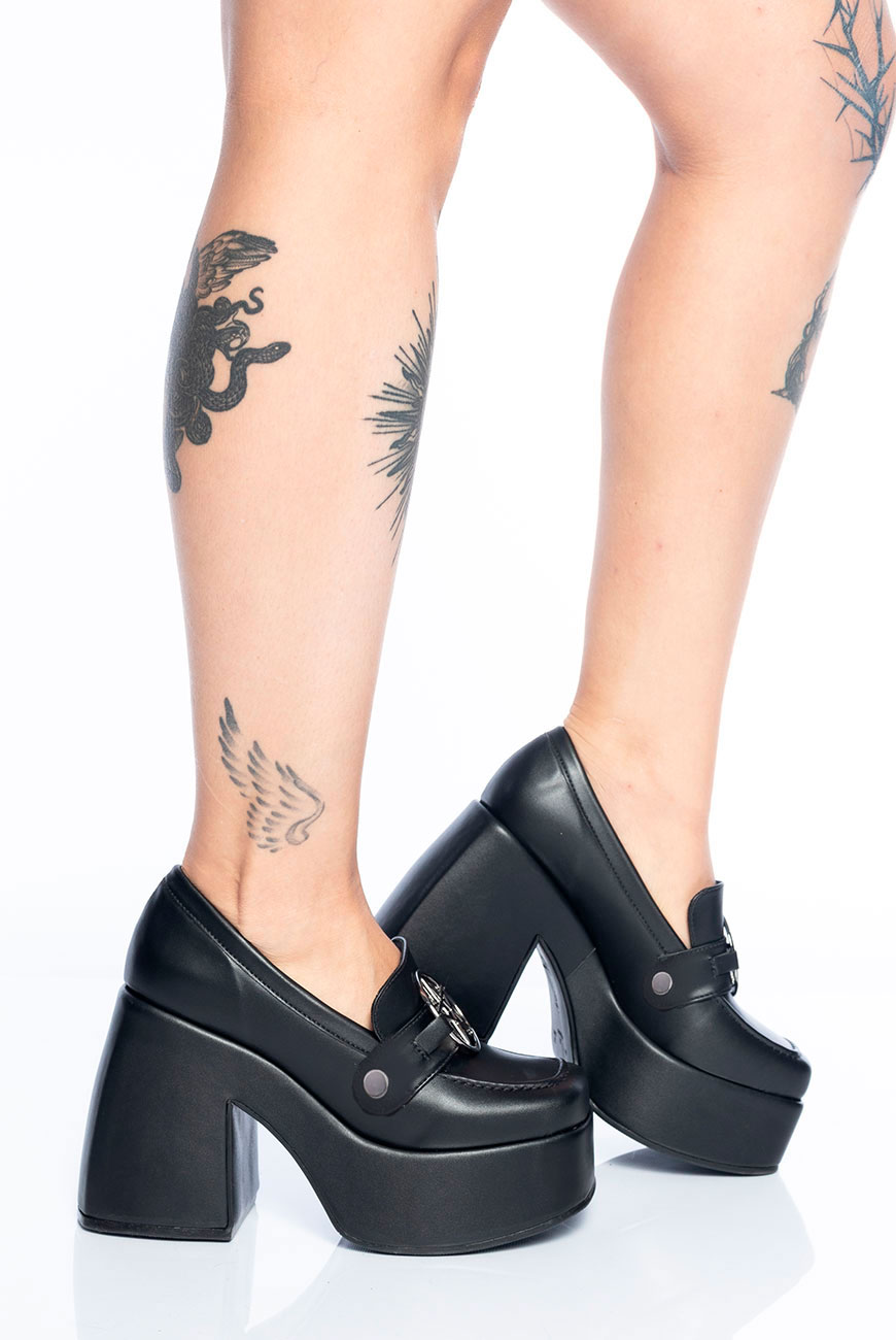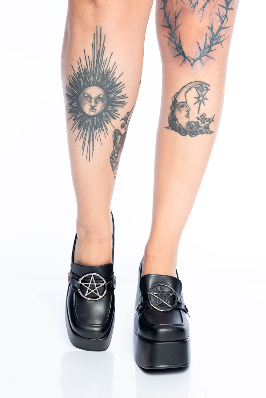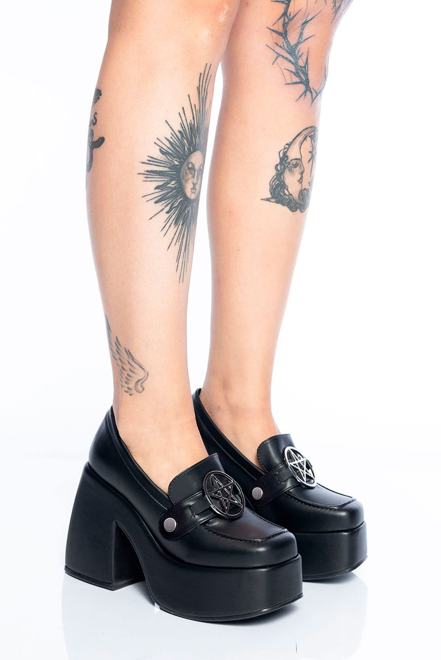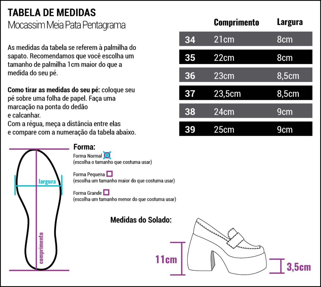O Mocassim Meia Pata Pentagrama Reversível é produzido em um material super macio e confortável, com salto grosso e plataforma na frente para mais estabilidade, além do detalhe mais trevoso de todos: nosso passador exclusivo de pentagrama no banho níquel.