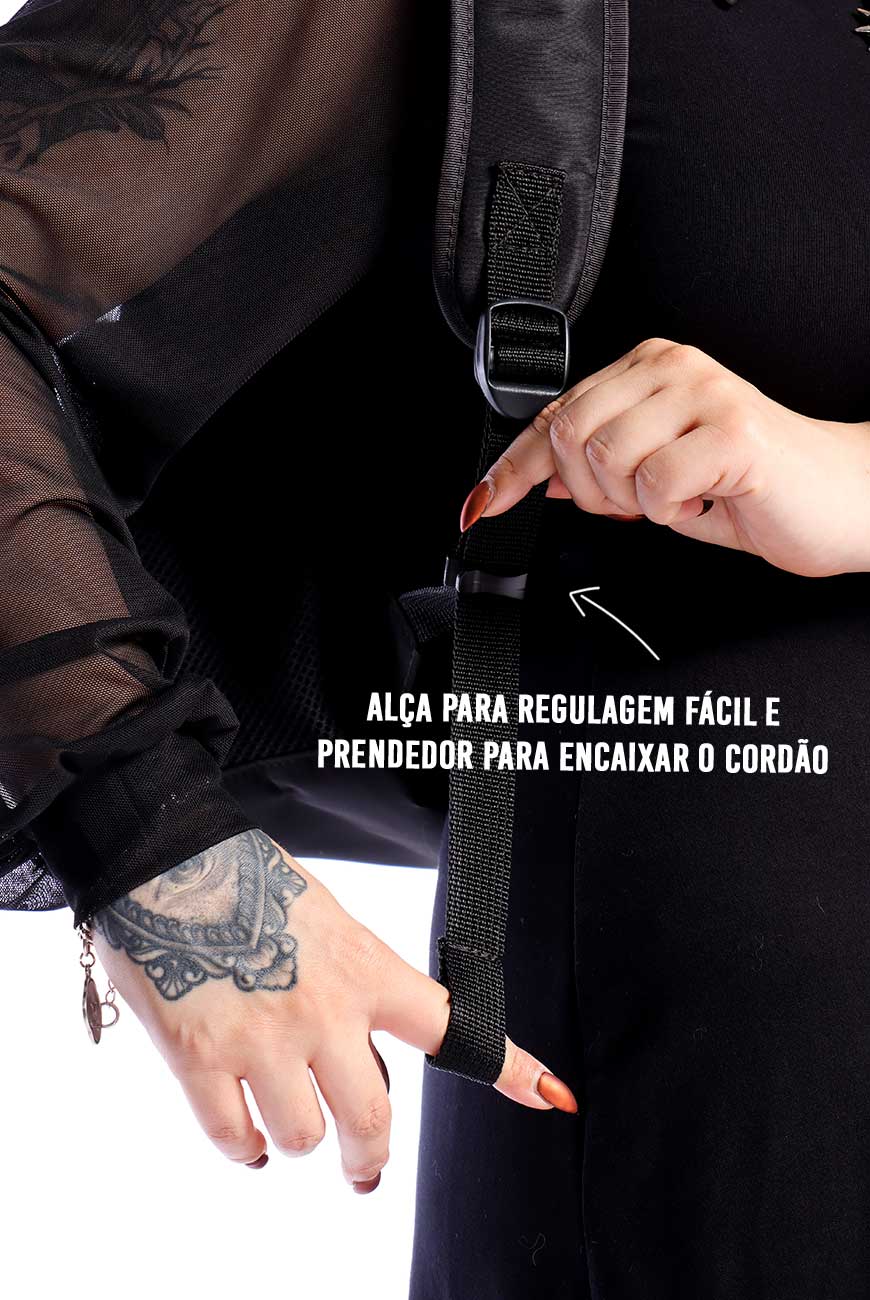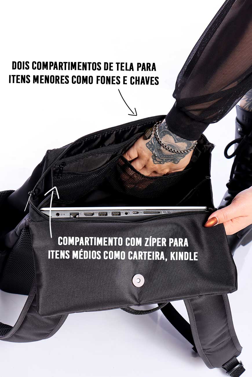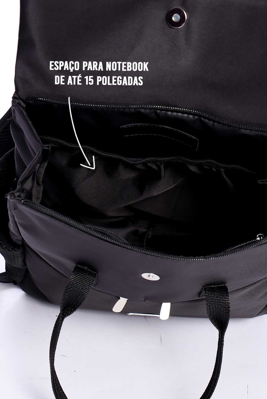Além disso, conta com dois compartimentos separados na frente com fecho de zíper para mais segurança, bolsos cantis nas laterais que comportam uma garrafa de até 1,5L e aba com fecho imantado para mais praticidade.