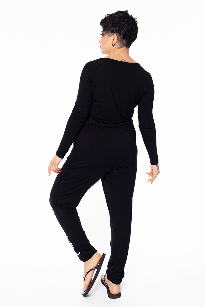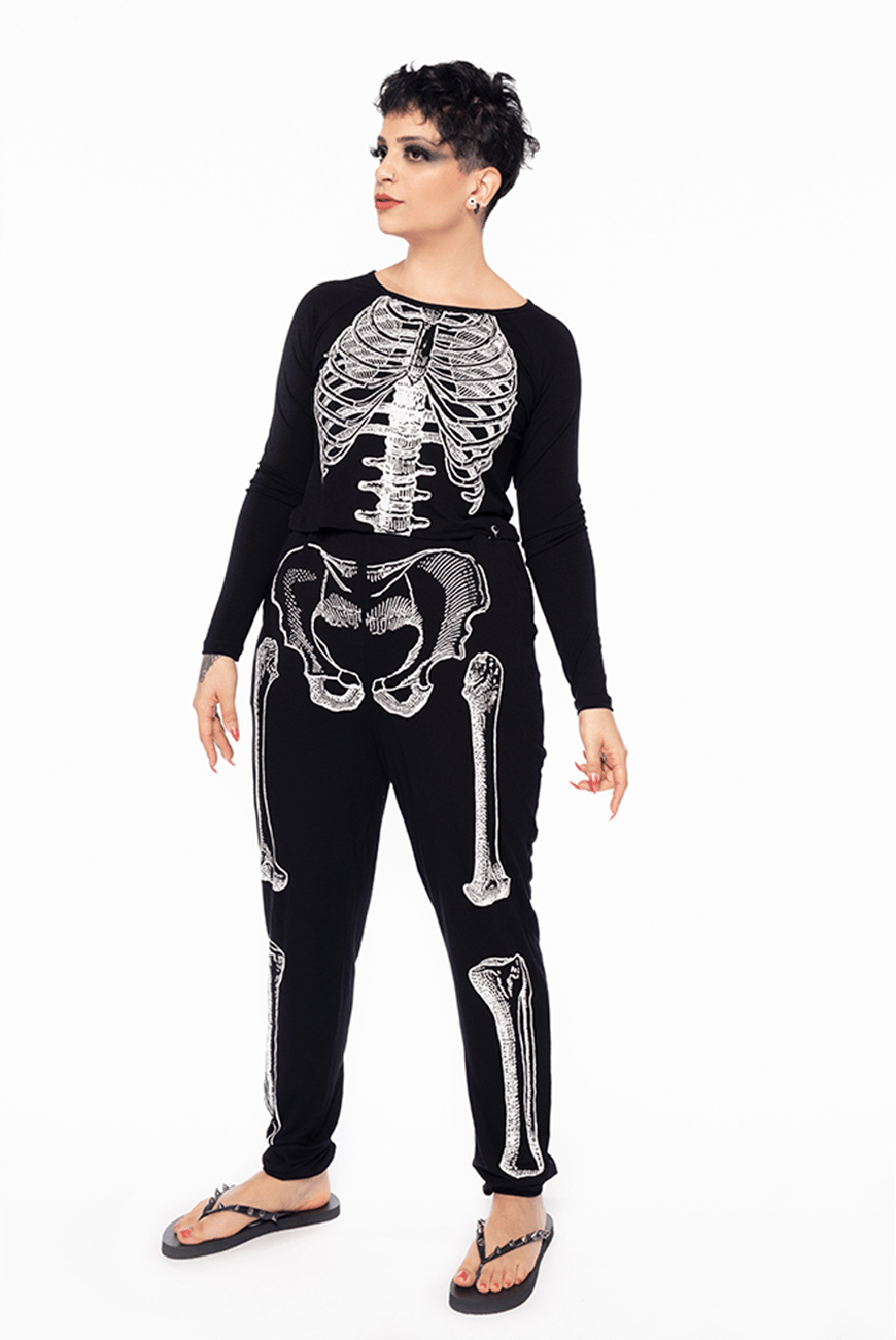 Conjunto longo de pijama perfeito para o seu momento de descanso. Feito em material de toque super macio contendo uma blusa cropped de manga longa combinando com a parte inferior de calça, ambos com estampa esqueleto na cor branca. Além de trazer conforto e estilo, são versáteis e podem compor look, em casa ou pra sair, sendo usadas como conjunto ou separadamente.