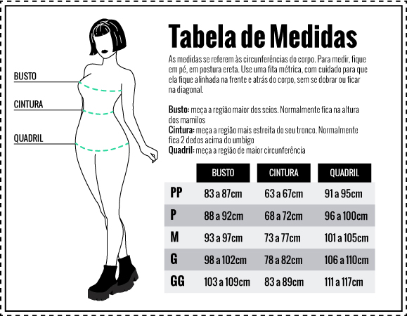 Modelo veste M. Altura: 1,60m/ Cintura: 76 cm/ Busto: 96 cm/ Quadril: 105 cm.
