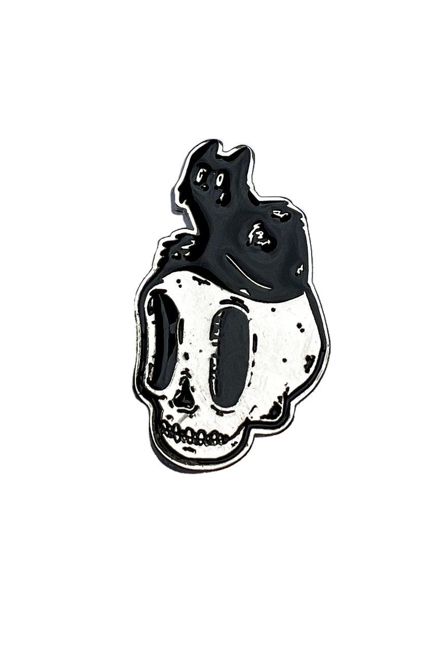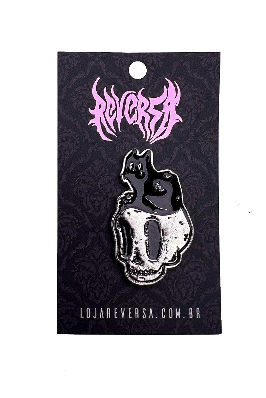 Pin de metal com design exclusivo Reversa, com um gatinho em cima de uma caveira. Fofo demais!