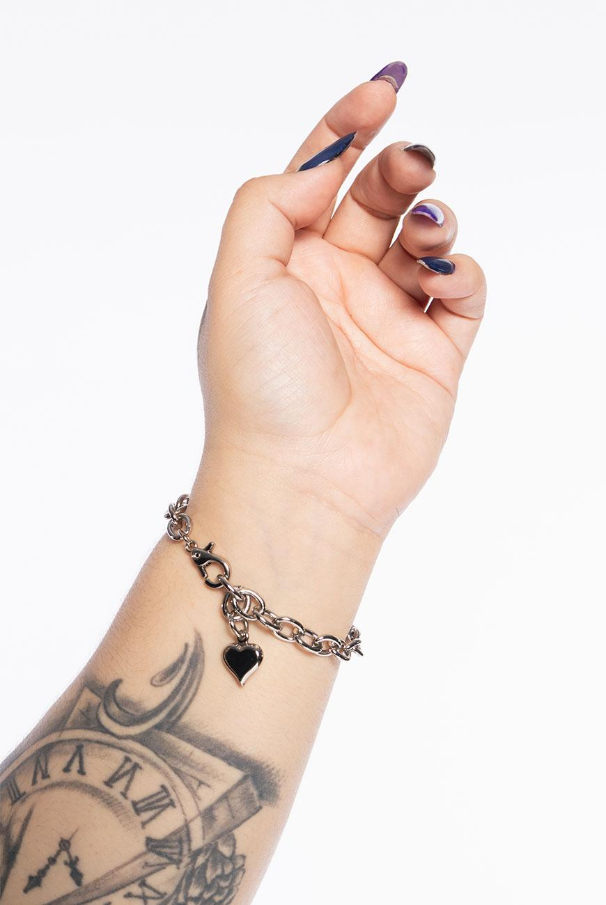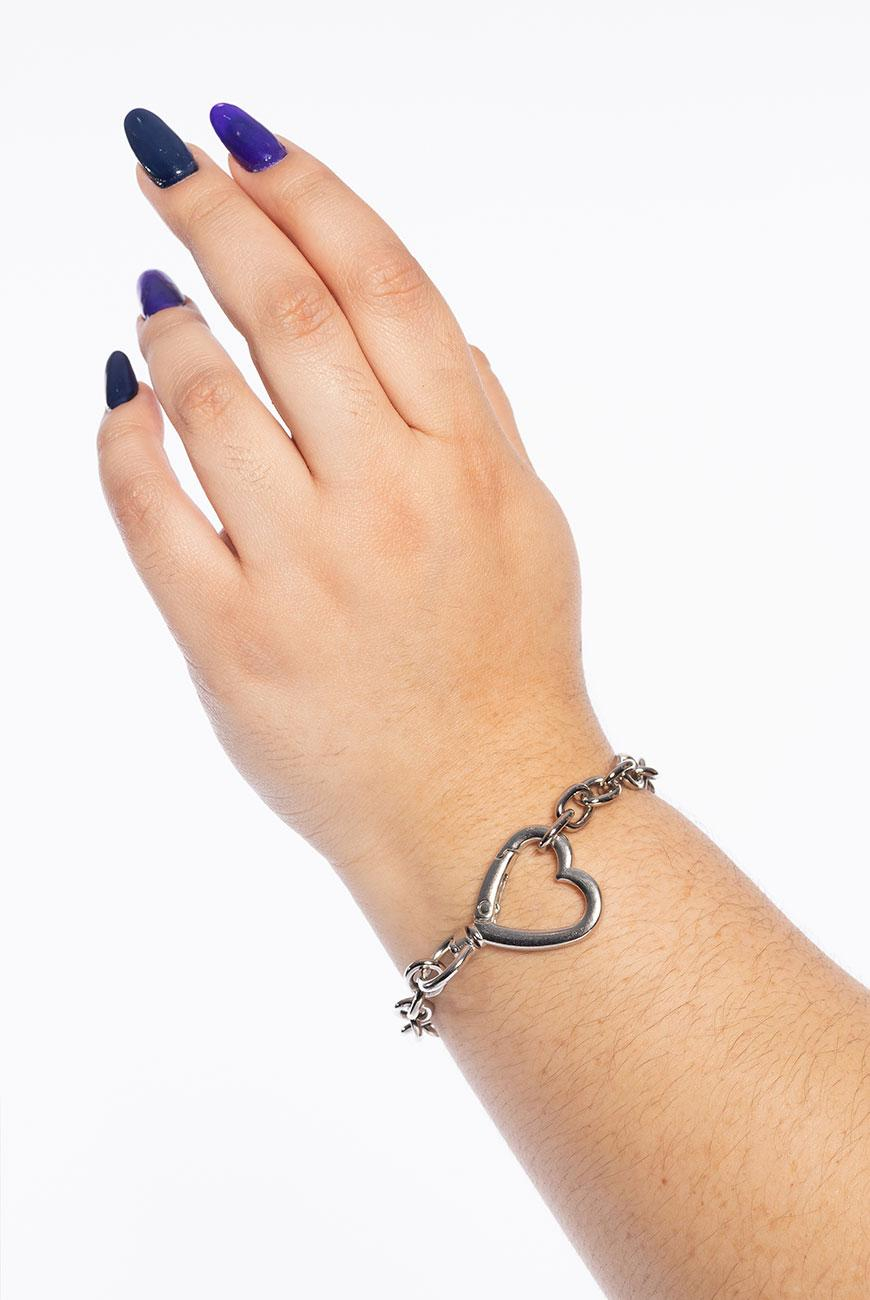 Pulseira niquelada de elo português, com um pingente fofíssimo de mosquete de coração. Fecho regulável de mosquete comum e detalhe de pingentinho de coração.