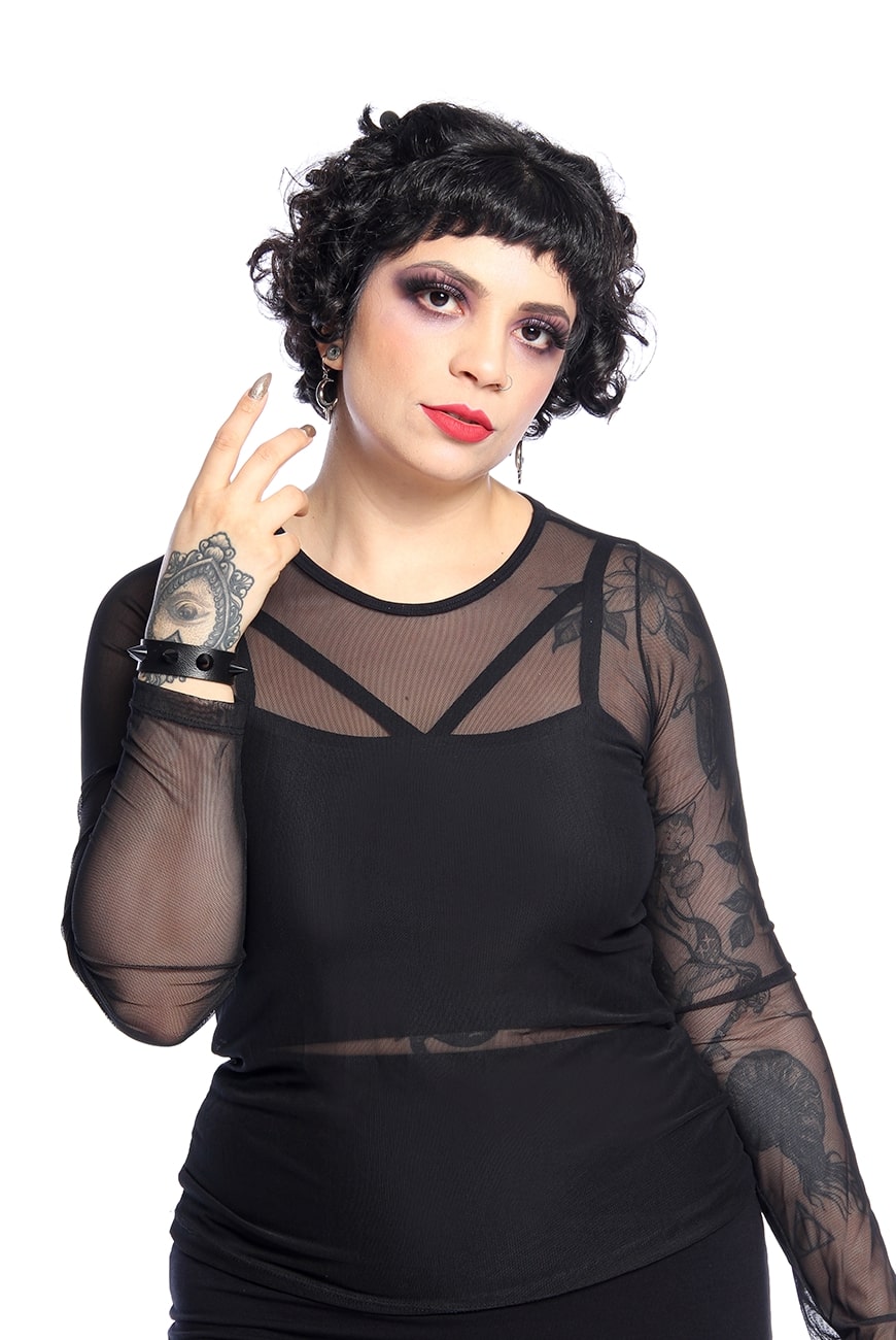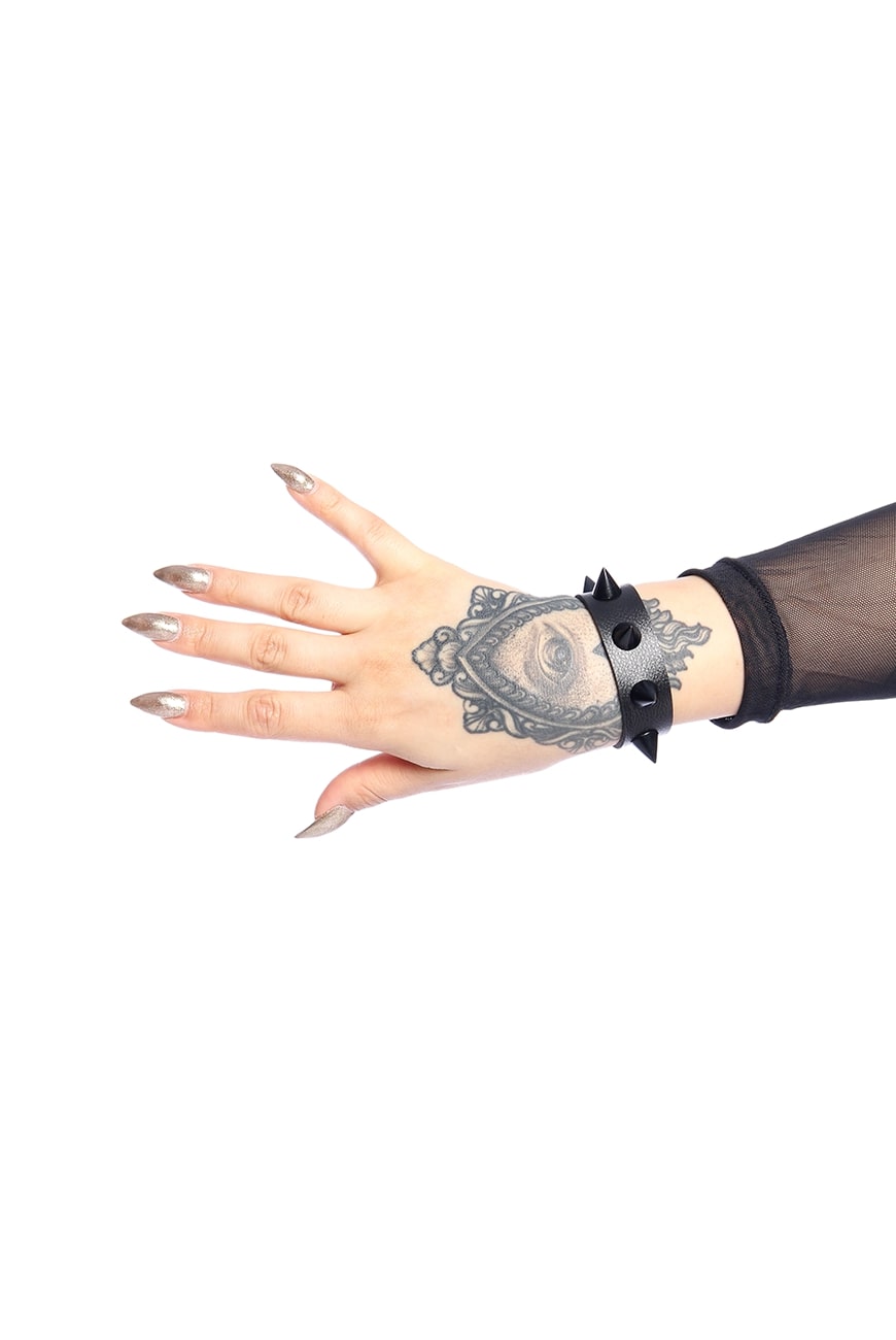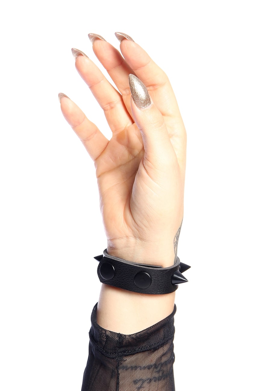 A Pulseira Spikes Catwoman Black é produzida em material sintético de origem não animal, contém tira de 2cm de espessura adornada por spikes pretos e fecho regulável por botões de pressão.