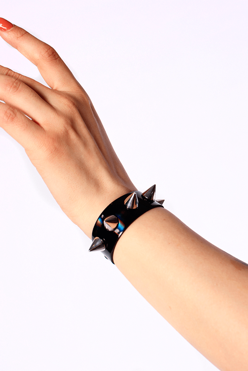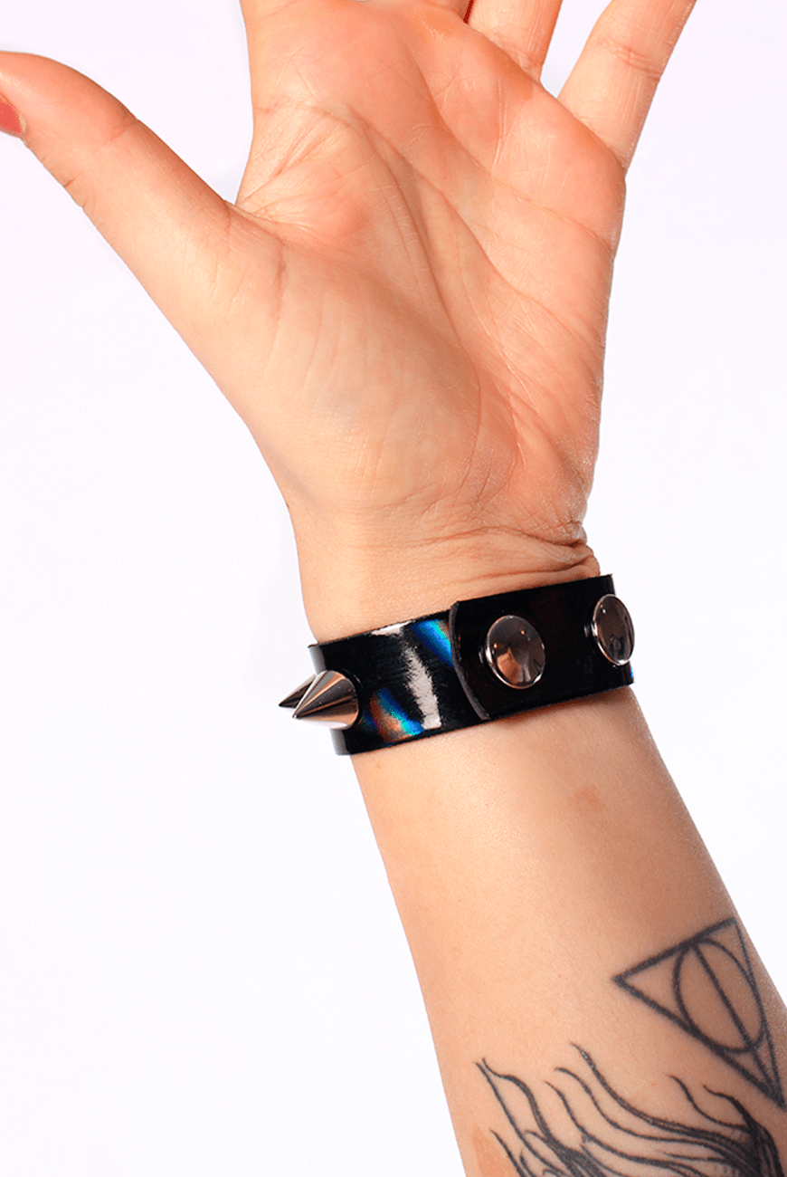 Pulseira feita em material alternativo de origem não animal com superfície de brilho holográfico. Tira de 2cm de espessura adornada por spikes em banho niquelado, fecho regulável por botões de pressão.