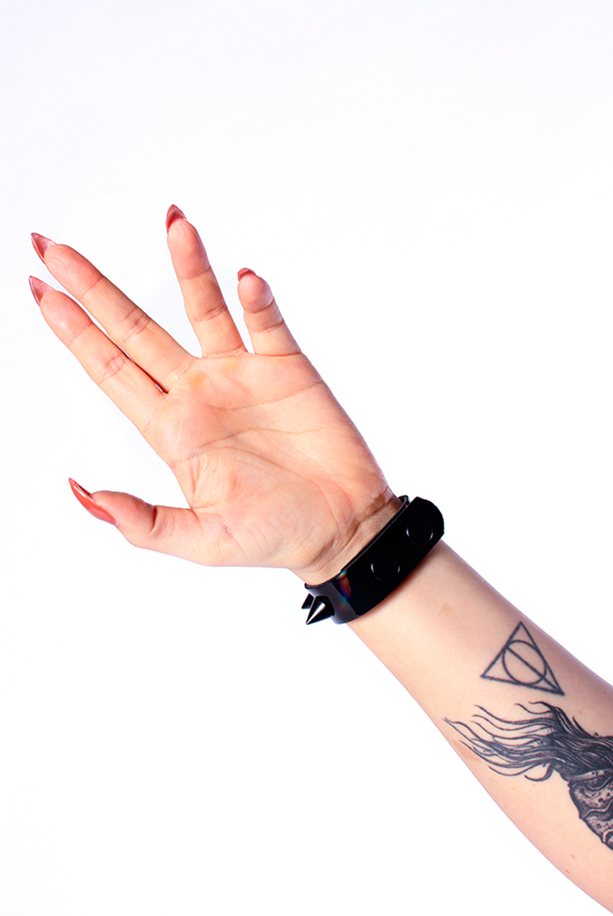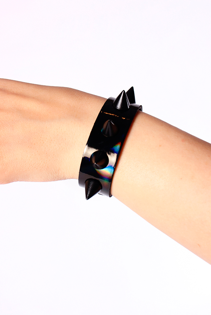 Pulseira feita em material alternativo de origem não animal com superfície de brilho holográfico. Tira de 2cm de espessura adornada por spikes em cor preta, fecho regulável por botões de pressão.