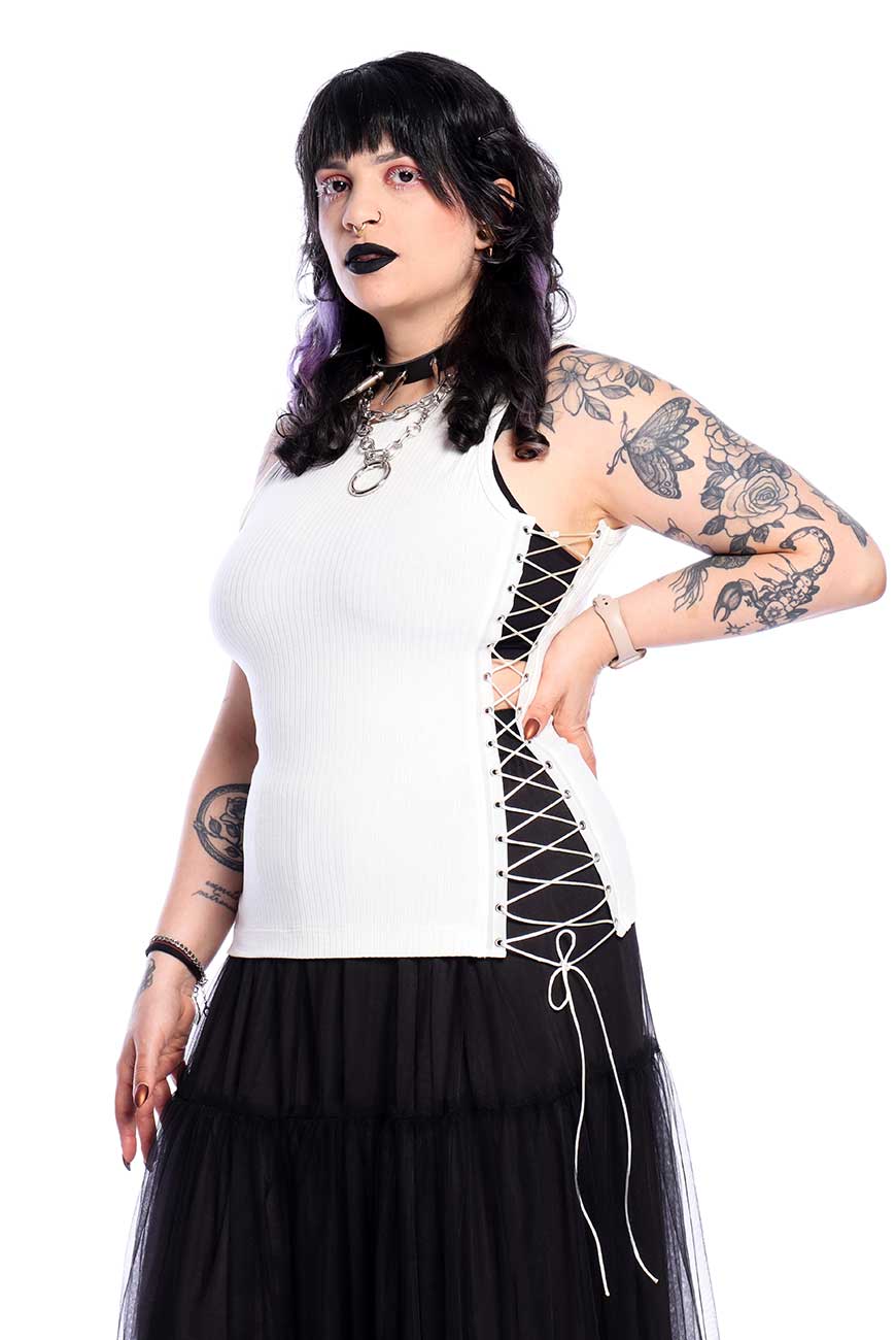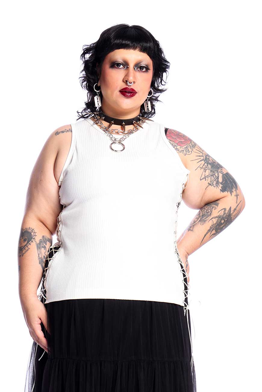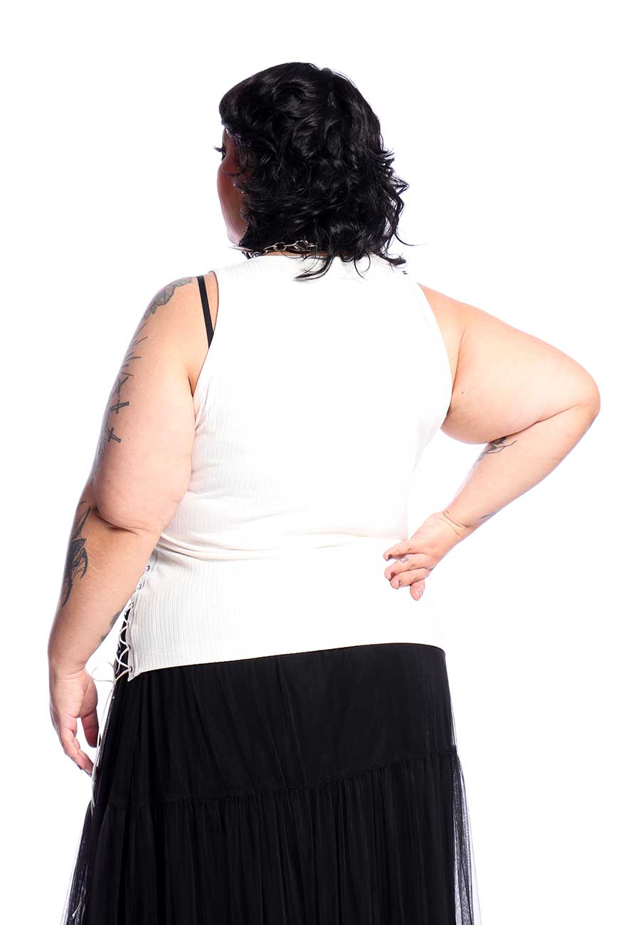 Produzida em malha canelada off white de alta qualidade e com toque super macio, é um modelo regata com recorte nas laterais e fitas de ilhós com rabo de rato para amarração, sendo completamente ajustável e trazendo muito estilo pra qualquer look.