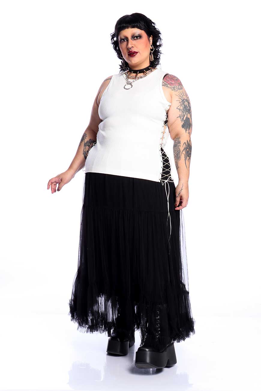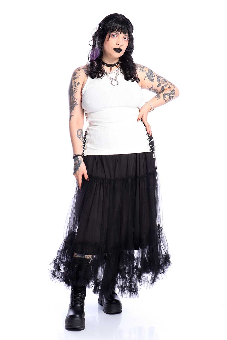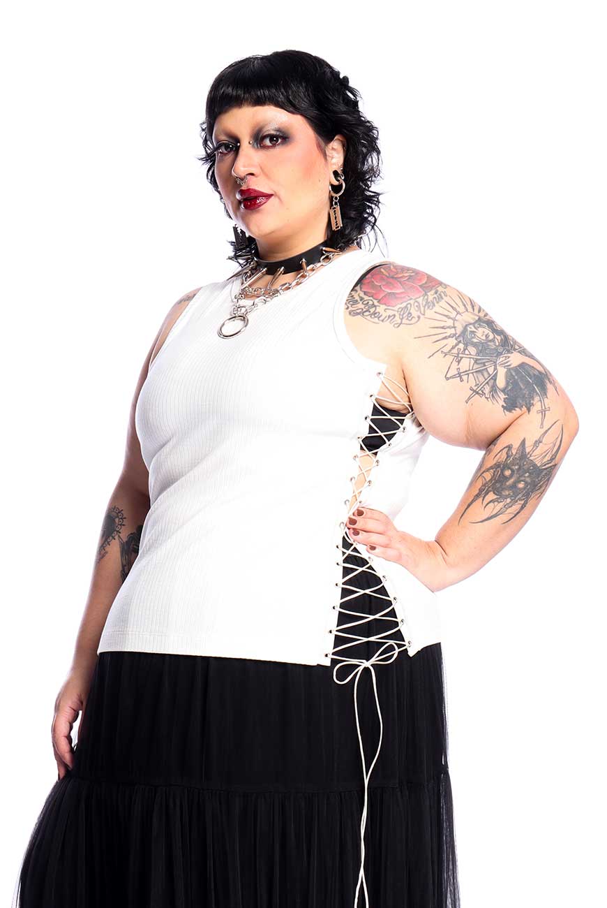 Produzida em malha canelada off white de alta qualidade e com toque super macio, é um modelo regata com recorte nas laterais e fitas de ilhós com rabo de rato para amarração, sendo completamente ajustável e trazendo muito estilo pra qualquer look.