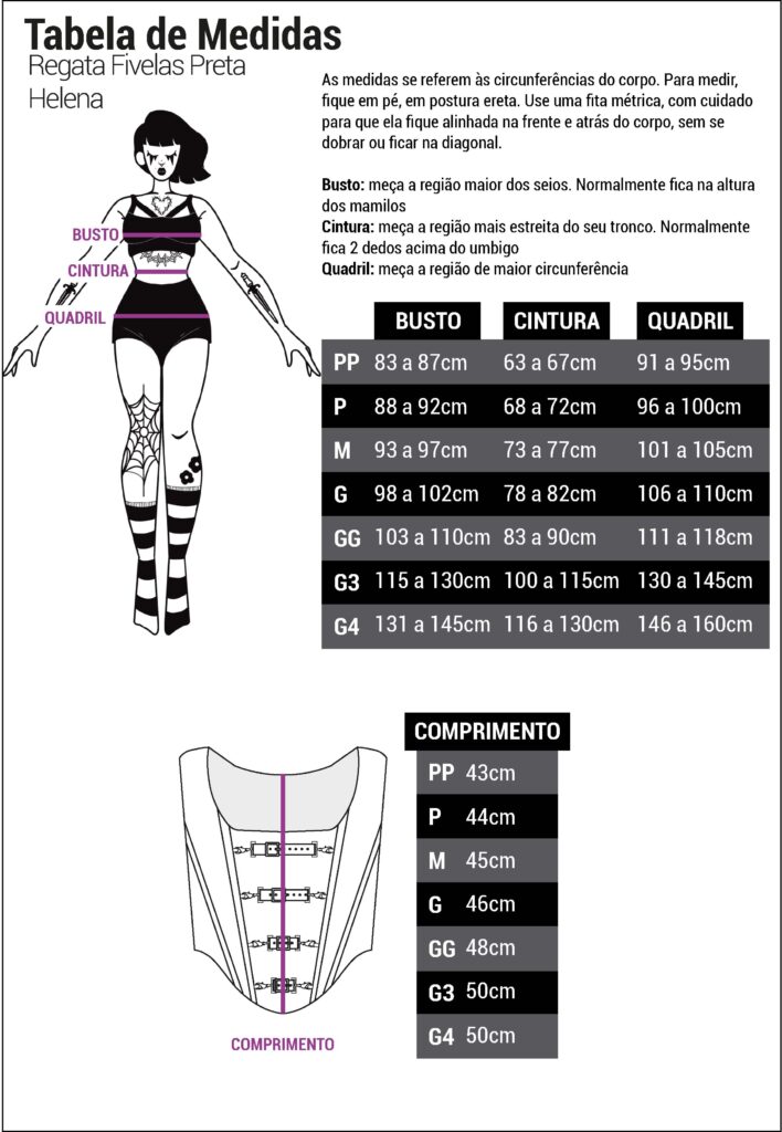 Modelo tamanho 3G: Altura: 1,60m/ Cintura: 96cm/ Busto: 114cm/ Quadril: 129cm.