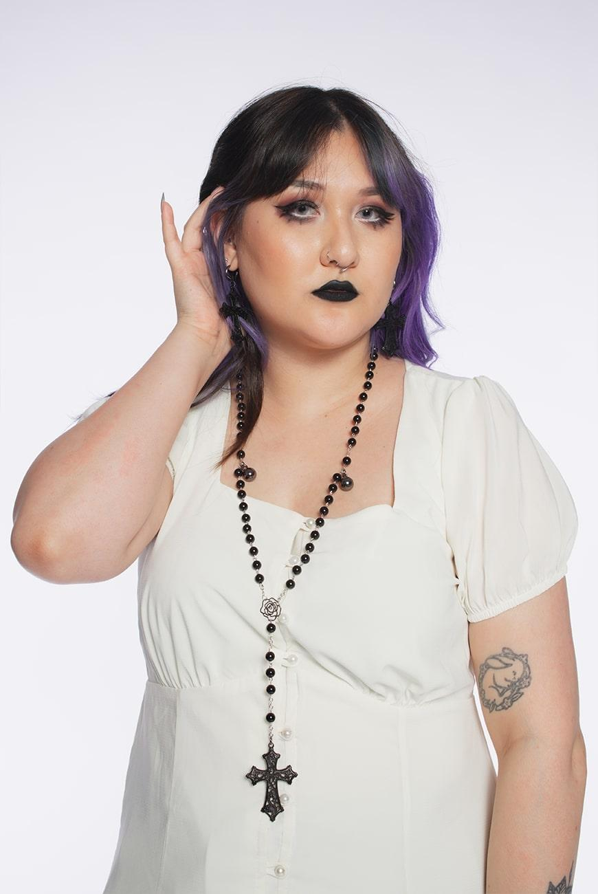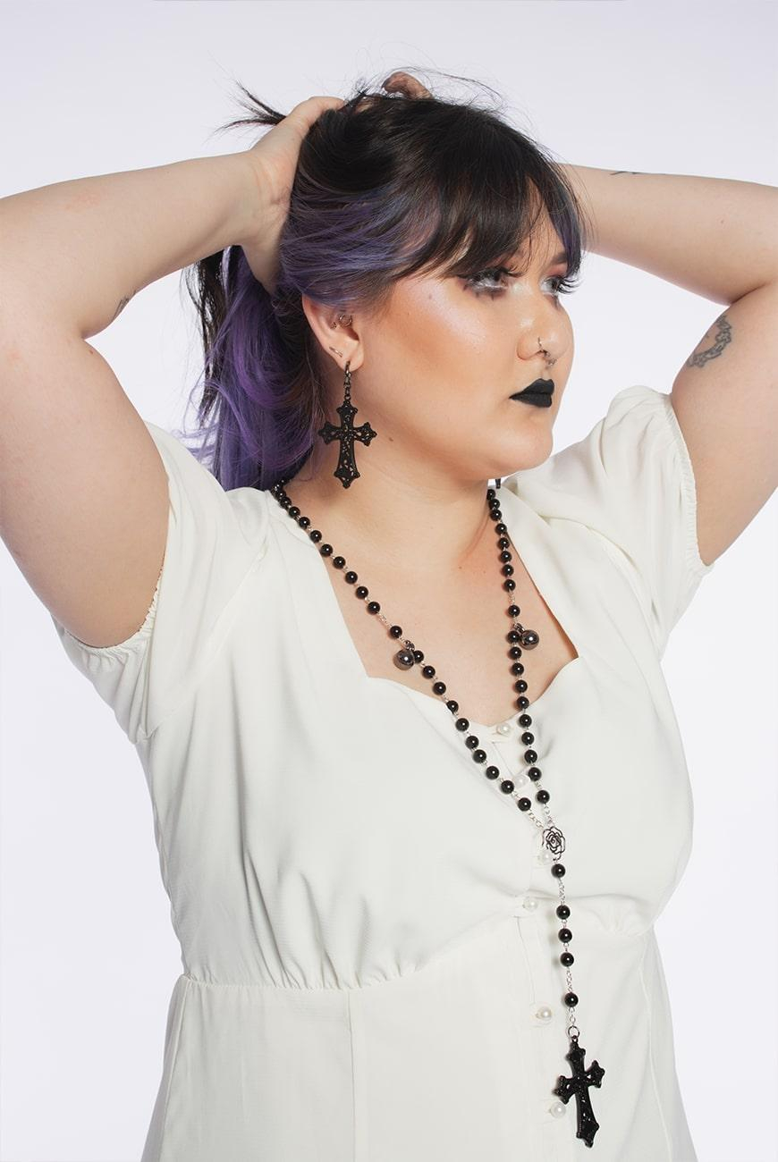 Colar tipo rosário clássico, feito à mão, com pingente de cruz preta ornamentada.