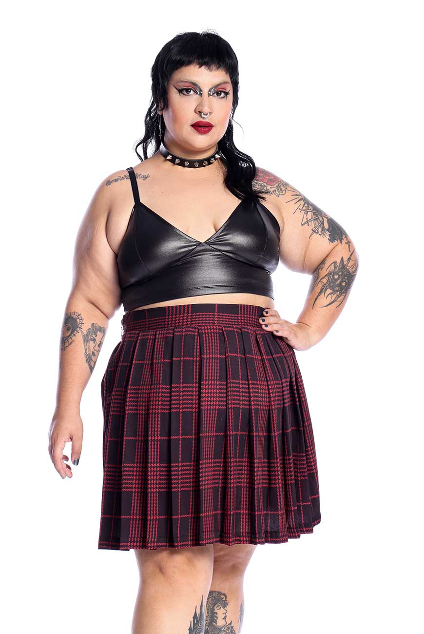 A Saia de Pregas Xadrez Preta e Vermelha Nina é a saia que faltava pra compor o seu look de show!